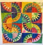 So I pulled out this unfinished paper pieced wall hanging that I had planned on making for my sewing room, which will now adorn my gray walls at work. I started it nearly two years ago. It’s been sitting unfinished because I needed to make seven more blocks to get it to the size I wanted. It’s made from Kaffe Fassett Collective fabrics and some batiks.