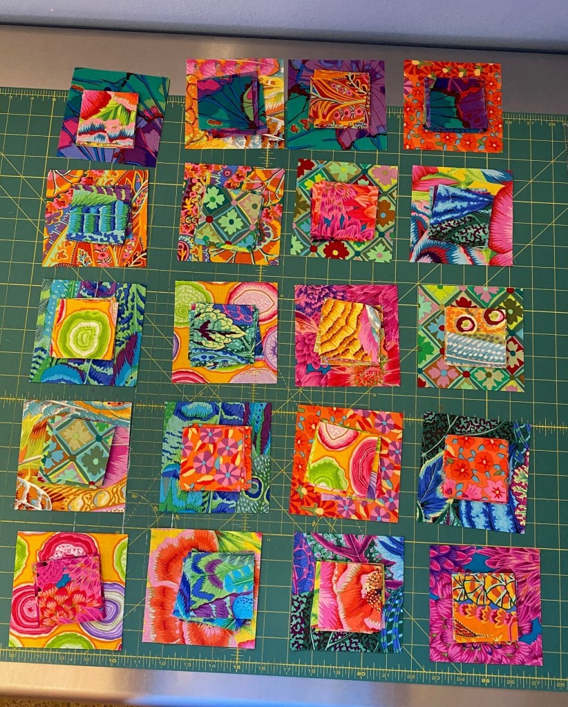 Each of the star blocks will be bordered by large rectangles of the same selection of KFC fabrics. It should have a somewhat scrappy and random feel when it’s all done.