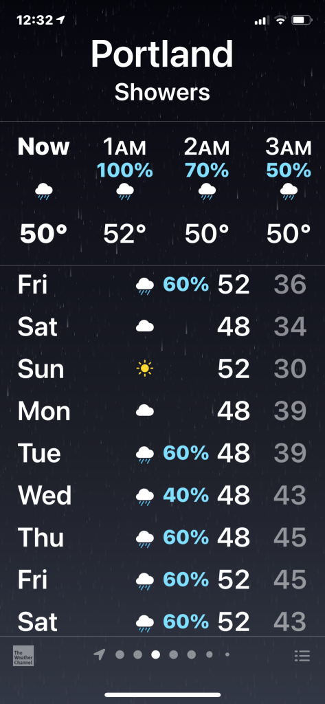 And after this amazing fall season, the rain started today. This rainy season will last until May or June. The winters in Portland are mild in temperature, but we do get A LOT of rain. Here’s what our next tend days looks like. And this is pretty much what the next eight months will look like.