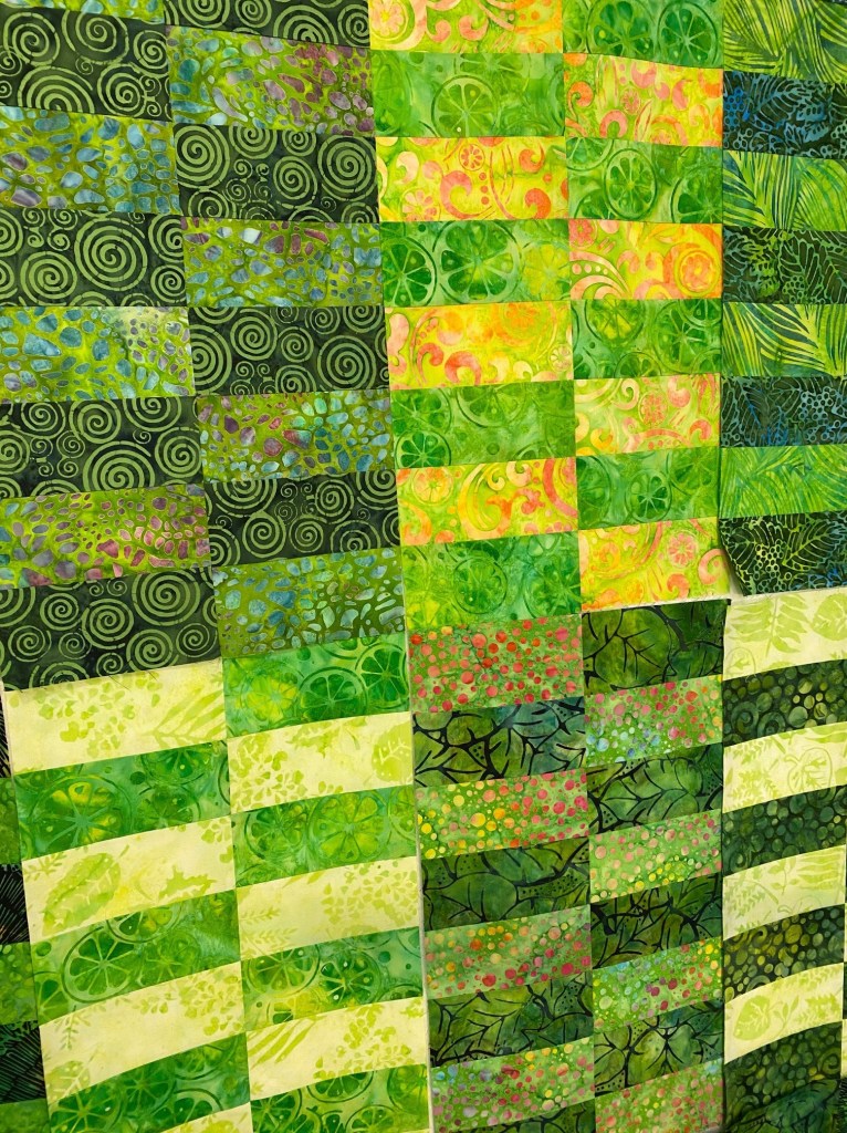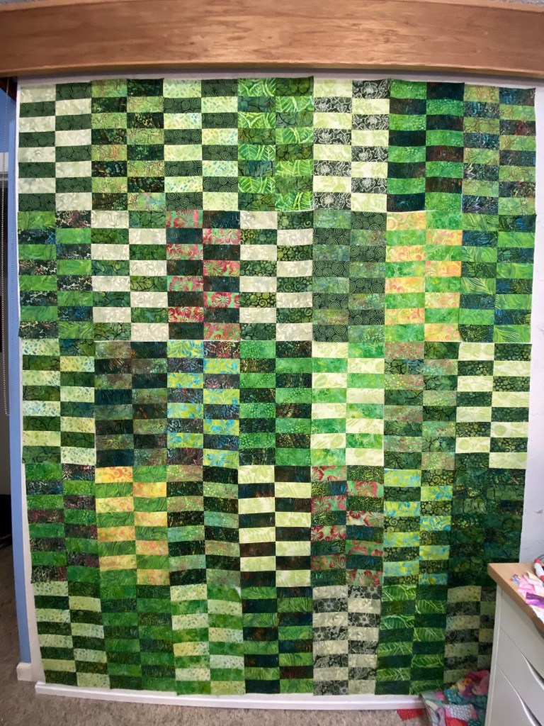 Funny, I thought I had a lot of green batiks. I have two plastic bins full. These were the best 16 for this quilt top. When the pandemic is over I’m going to be going about buying fabrics differently. I’ve always just purchased fabrics that I like, with no attention to the value of the pieces I was buying. It’s amazing to see how few light value fabrics I have. In the future I’ll be more deliberate in purchasing fabrics.
