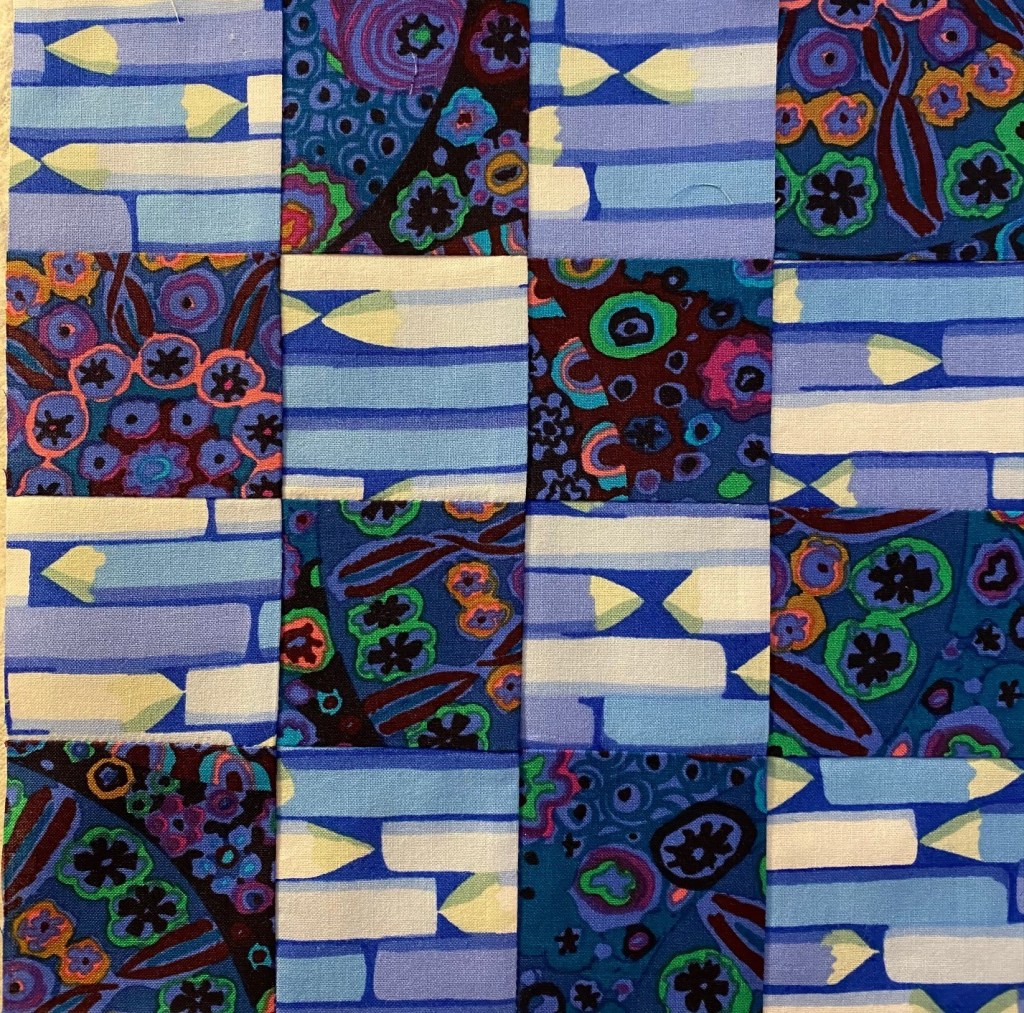It’s so interesting to me that the Kaffe book calls for you to assemble these blocks square by square, rather than by making strip sets. I’m pretty sure I wouldn’t make one of these if I couldn’t do it with strip sets. If you look at the striped fabrics in the photo above you can see that the striped fabrics are going every which way. It’s a cool effect but not cool enough for me to assemble these square by square.