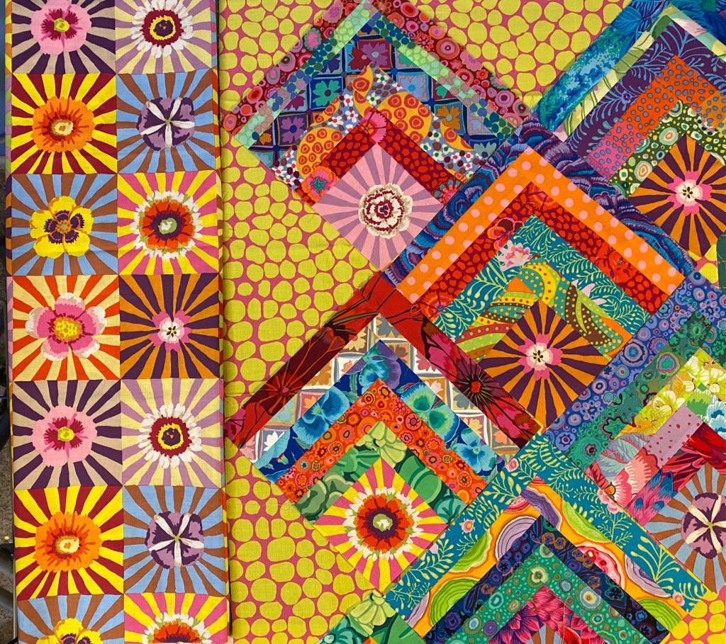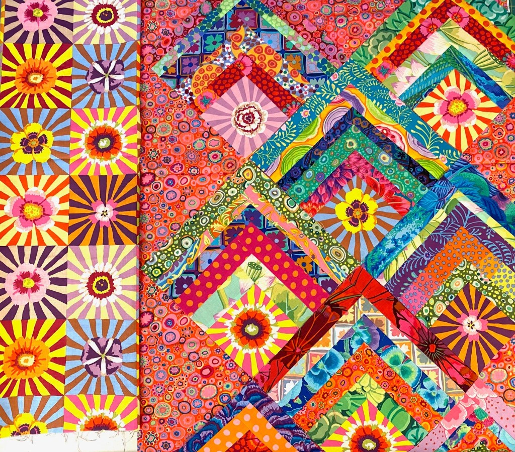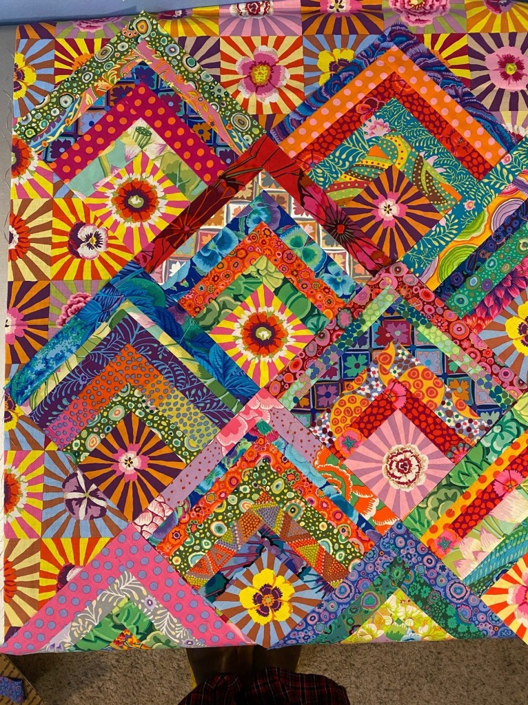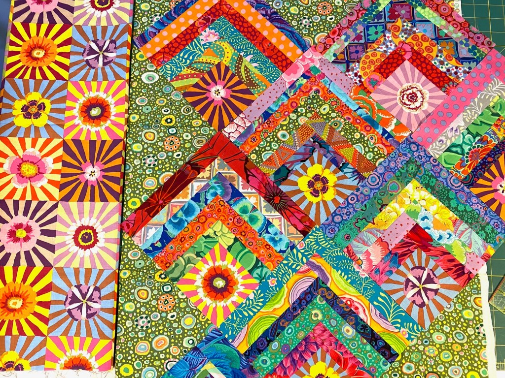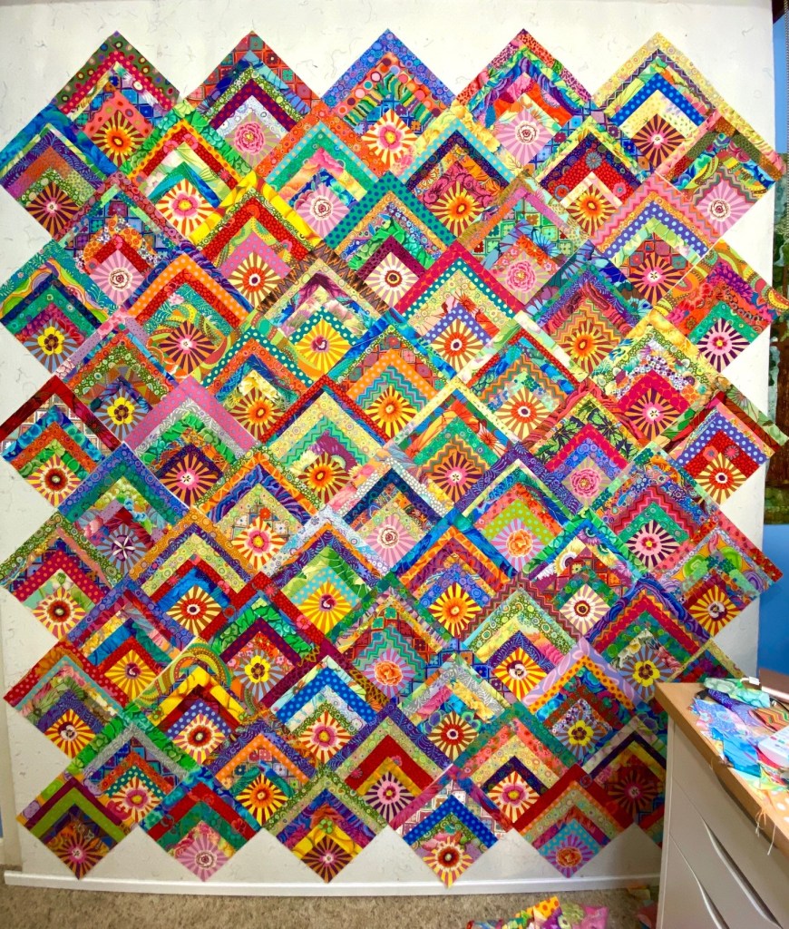 And now for some real color! Here’s where I am with my scrappy sunburst half log cabin blocks made from KFC fabrics. This will be a gift for my brother and his wife. I’ve asked him to measure their bed and the drop they want so I’ll know how big to make this.