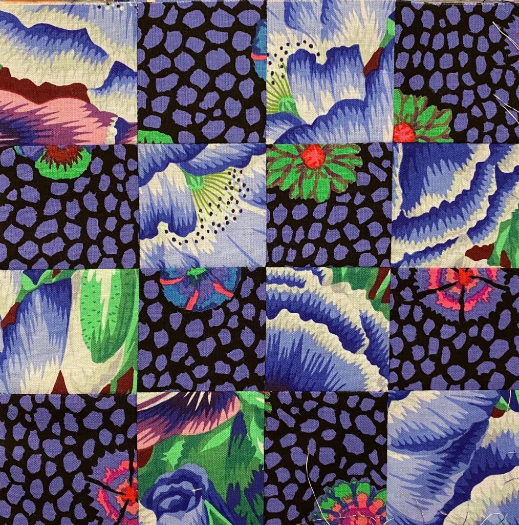 With this lengthy phone conversation and texts back and forth with photos, I didn’t get as much assembly on my 16-patch quilt completed as I had hoped. But I did finish six of the ten rows and that’s pretty good progress. So 3/5 of the quilt top is complete.