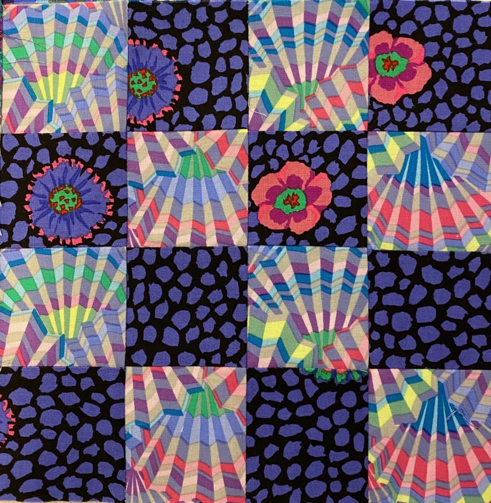 And guinea flower again. I love the pop of colors of those little flowers on the dark background. And those fans are doing some pretty fun stuff in those little squares.