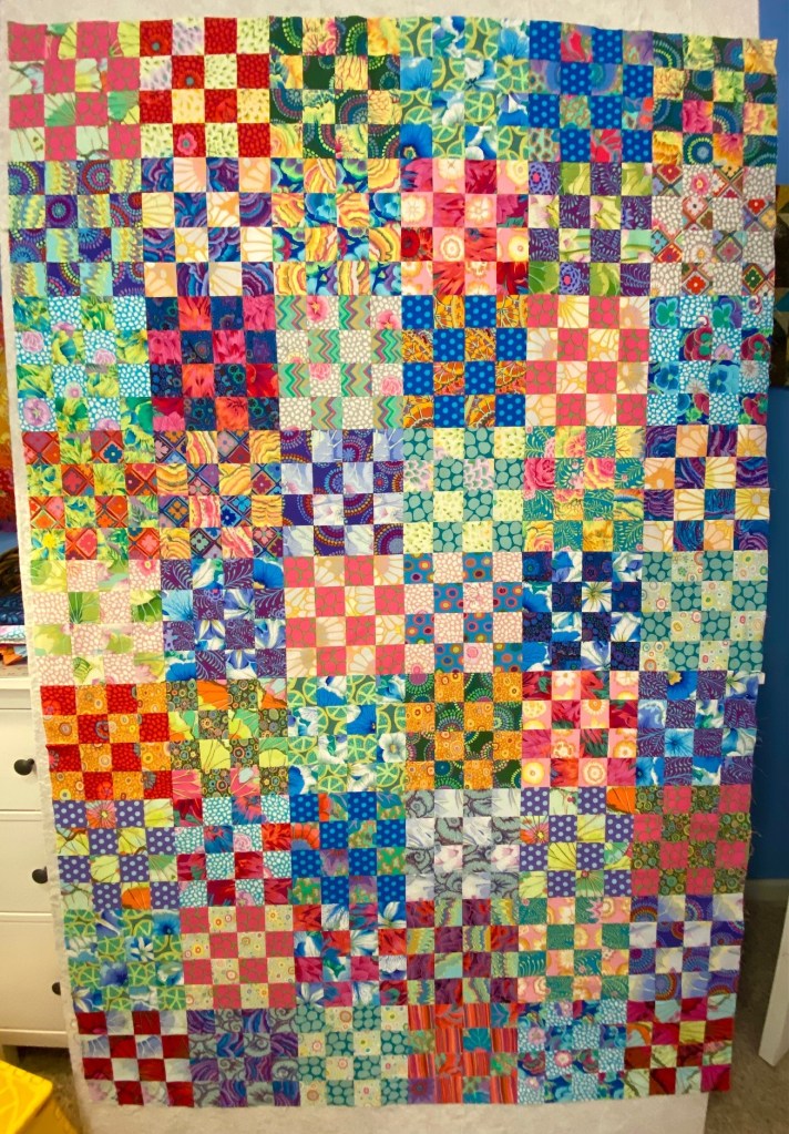 This is 67 blocks. I’m guessing I’ll have to make at least 20 or 30 more to get this up the size I need. It will have some big borders to provide the drop. Good thing I have a lot of scraps left!
