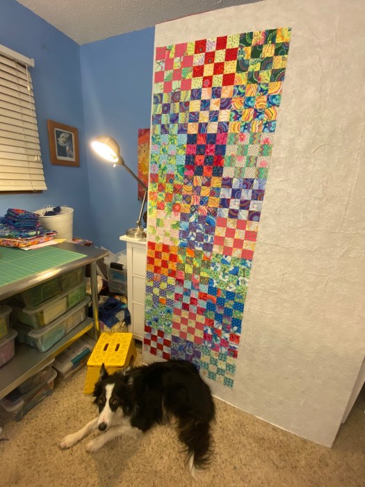 I did a few tweaks to this and I think it’s close to being done. I’ll leave it up on the design wall for a few days before I start sewing it together.