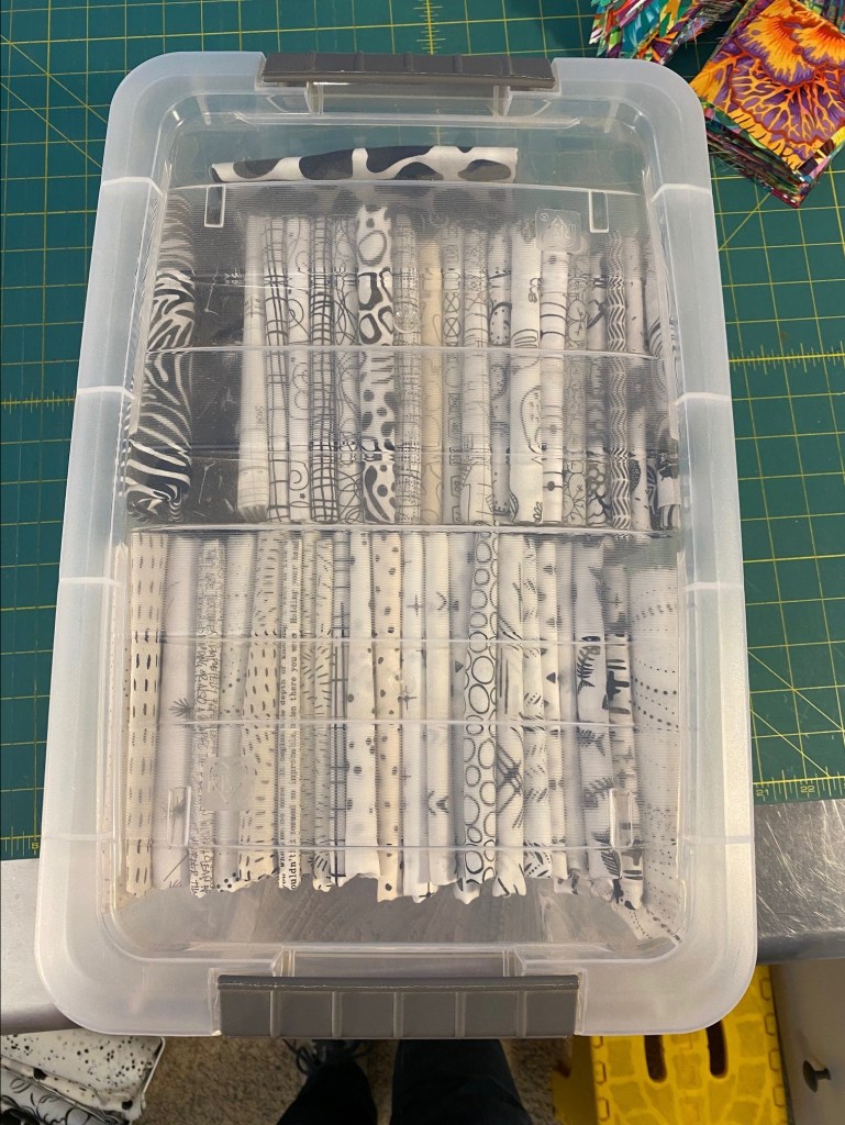 I was able to get my previous stash and recent purchases of white with black fabrics into one plastic bin. This is a short term solution. I have more of these coming from three different online stores… almost 40 more half yards coming.