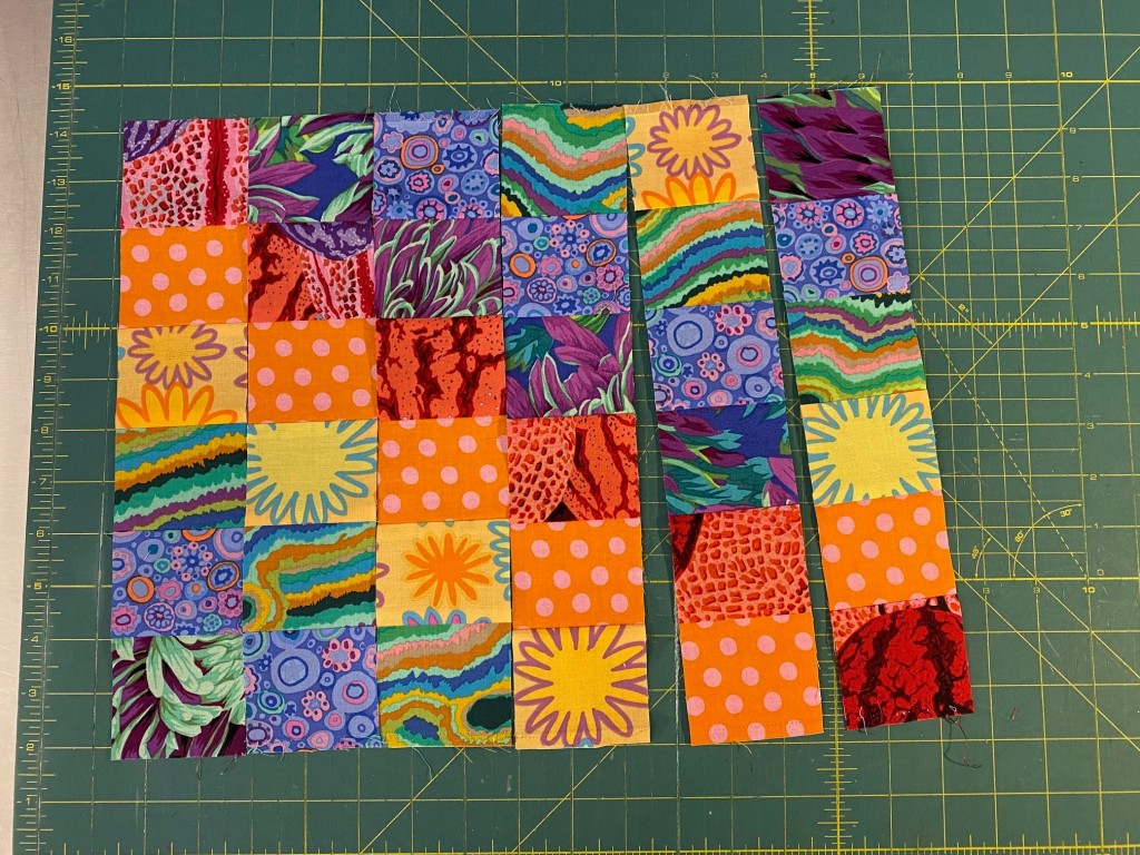 I will have about 12 inches or so left over in each strip set — not enough to make another block. So I’ll have to come up with a project to use that all up.