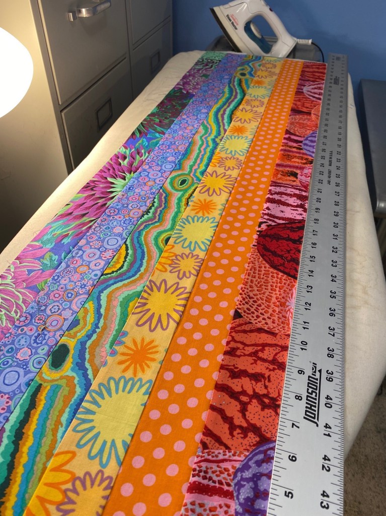 Here’s the first strip set on my ironing board. Holy cow! Look at all that gorgeousness!