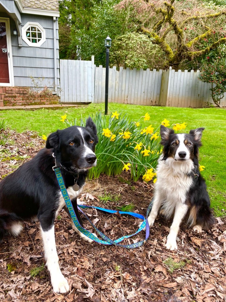 Here’s my boys on our afternoon walk today… posing in front of someone else’s daffodils.