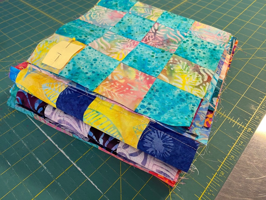 So I pulled out my scrappy batik sixteen patch blocks and got all ten rows pinned together.