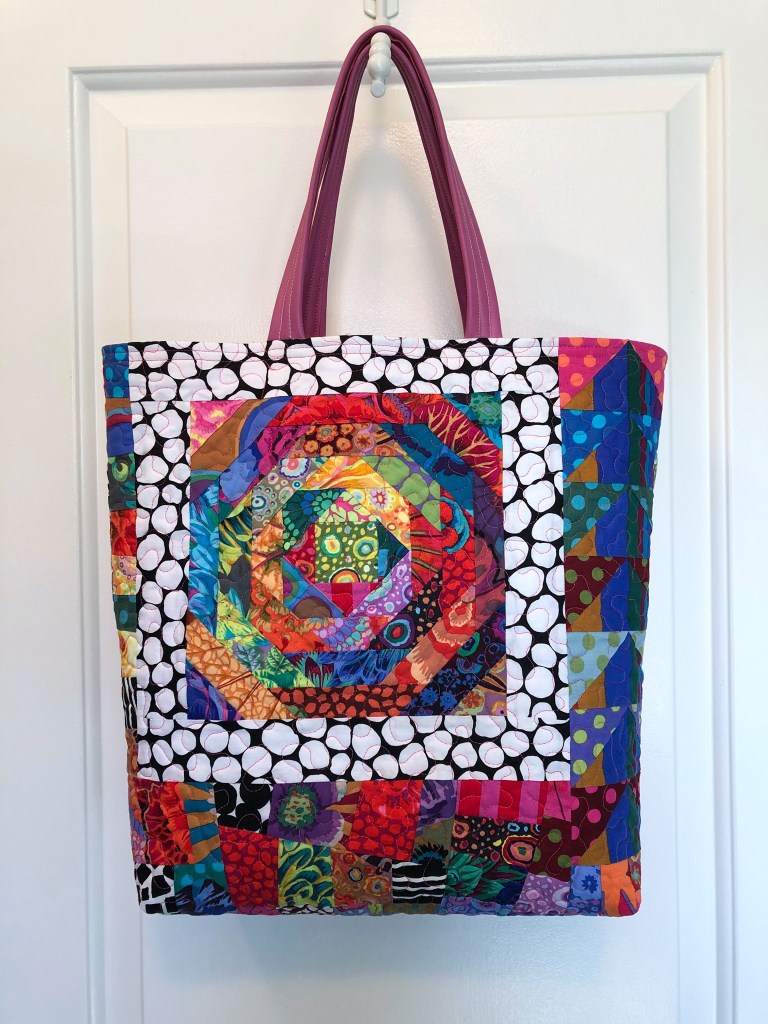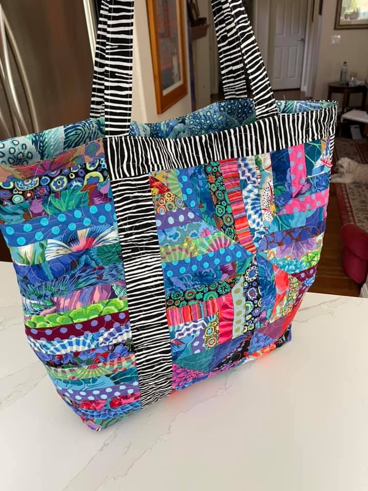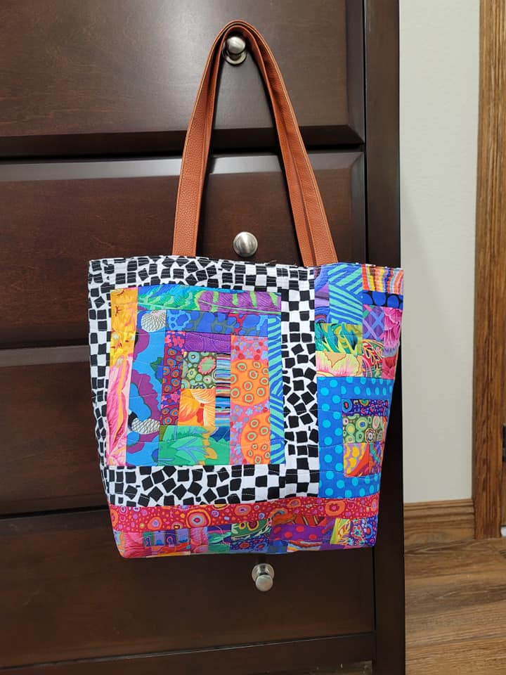 The third bag was made by Susan Conant. She did a really nice job of combining KFC fabrics and batiks. And I just love that white and black spot on the front.