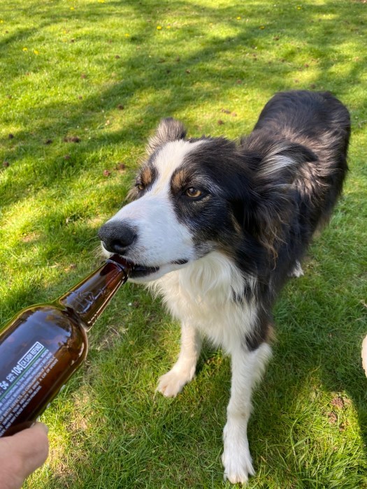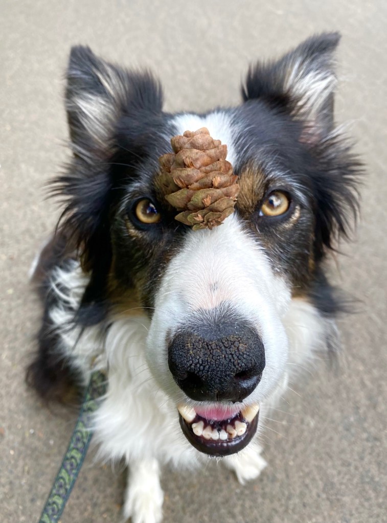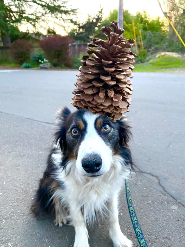 We found a HUGE pine cone on our walk last night. So, of course, we had to balance it on Bender’s head!