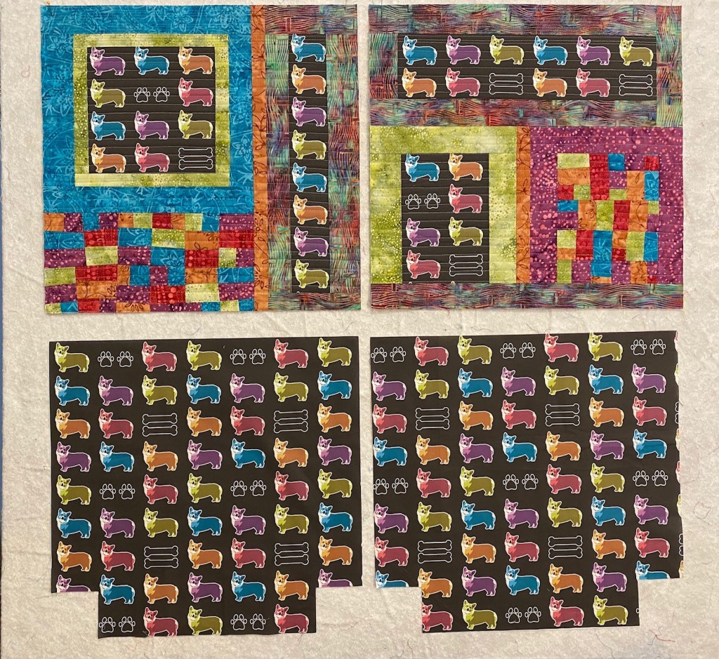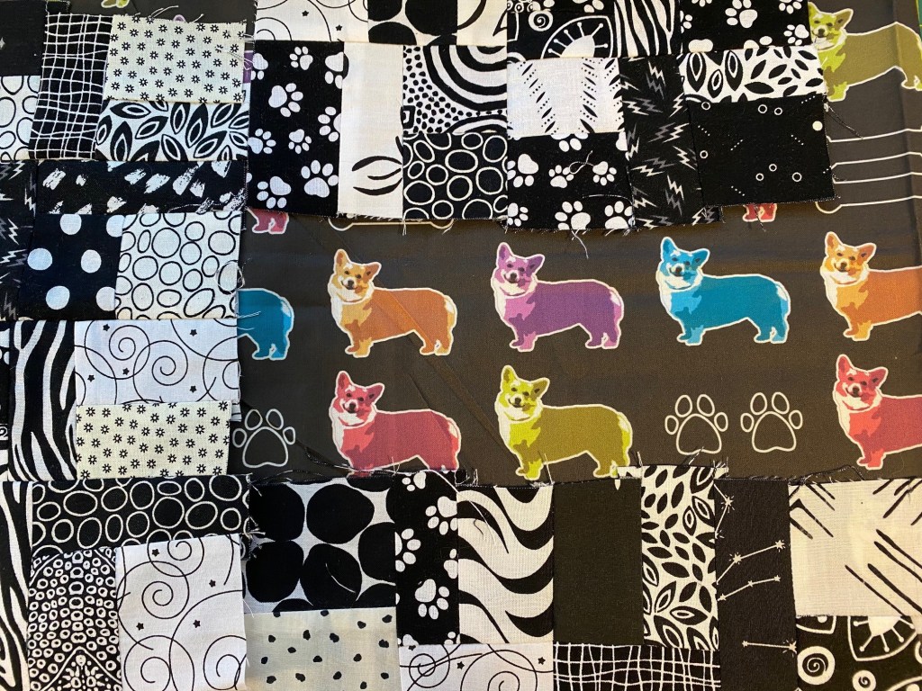 I was thinking I would use the same black and white fabric crumb pieces, but when the corgi fabric arrived it was clear that the fabric wasn’t black, but sort of a dark brown/olive green kind of color. And it looked terrible with the black and white crumb pieces.