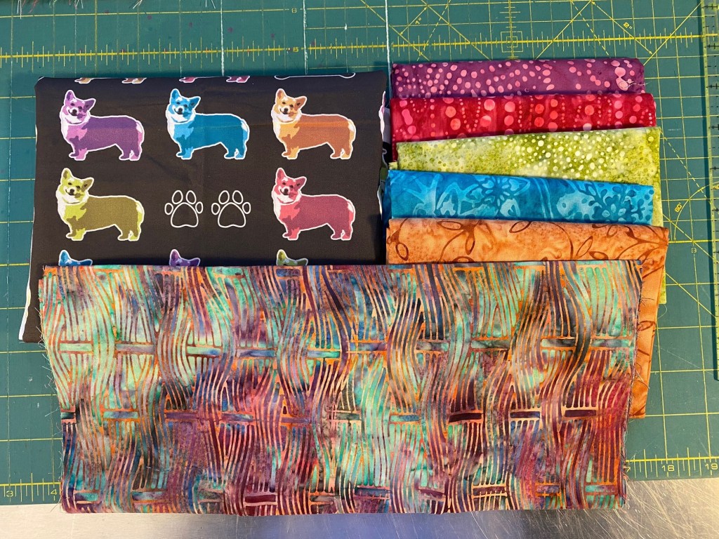 I went with saturated batiks that are the colors of the little corgis. The fabric at the bottom (above) combines several of the corgi colors.