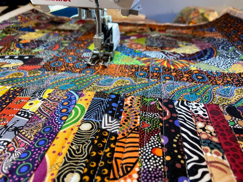 I just love all that straight line quilting. It adds some structure to all those curvy and organic designs in the fabrics. I’ve gotten to where I can quilt one of these panels pretty quickly and accurately. Have I ever said how much I love my walking foot? I REALLY love my walking foot!