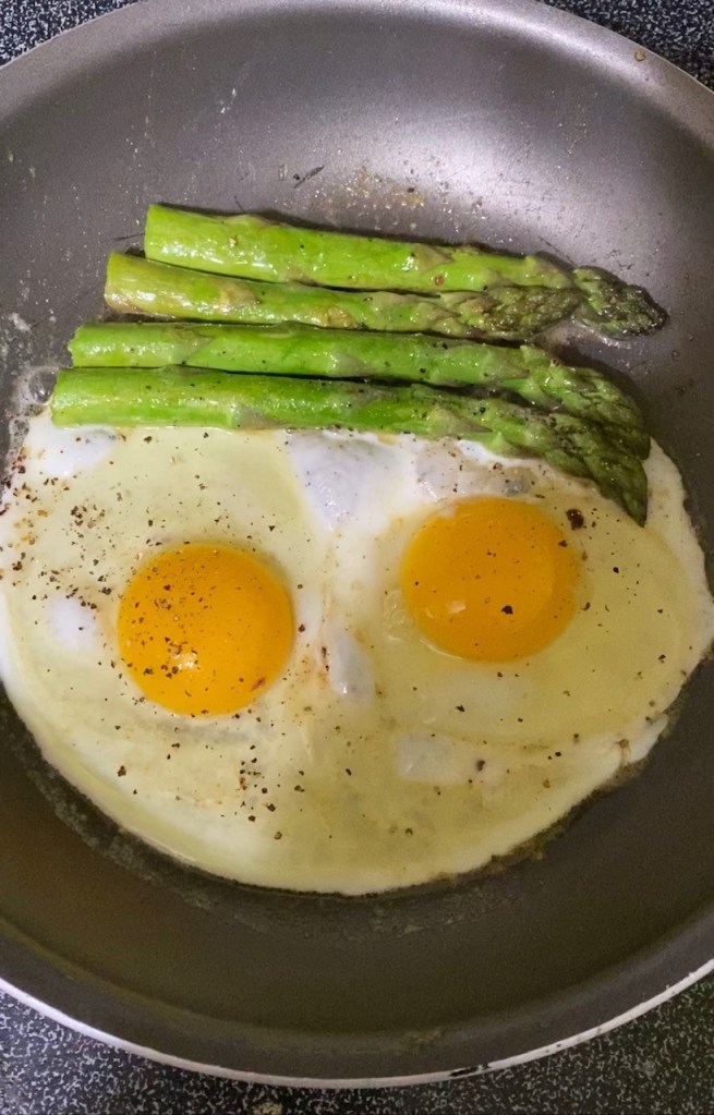 I had a very simple yes delicious dinner tonight. I got some farm eggs from a friend on the weekend and I fried them up and ate them with some fresh asparagus.