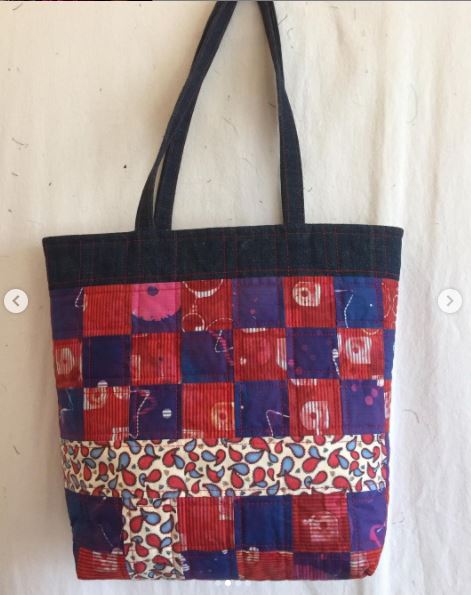 This final bag was made by Susan Cook. She made this bag from Japanese fabrics that were left over from a quilt she made many years ago and said she never imagined she would ever use those scraps. She has made this bag as a gift for her sister-in-law who is Japanese. She’ll be hand delivering the bag in a few weeks.