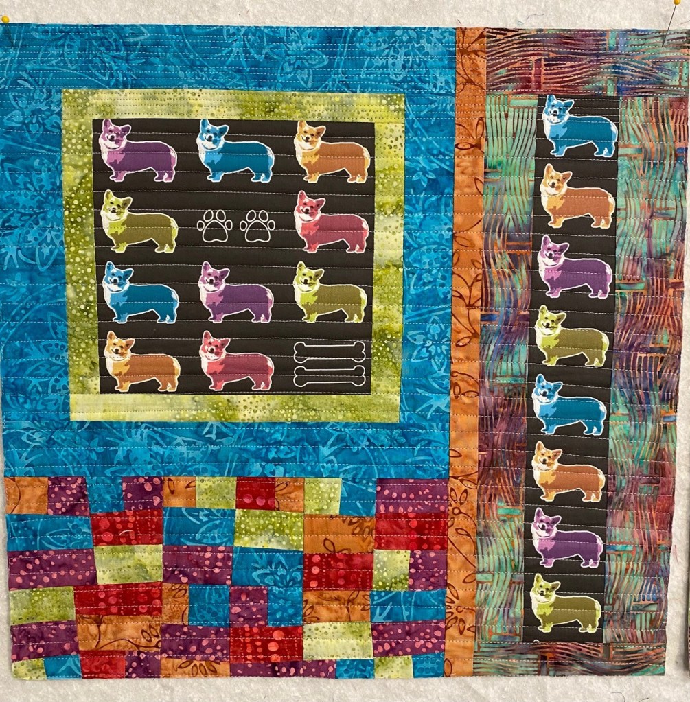 I just love that long strip of corgis on the right. I think it will all be fun when it’s quilted and assembled. I didn’t piece any blocks with the corgi fabric because it doesn’t lend itself well to piecing. I’m toying with a couple of ideas for the other side of the bag.