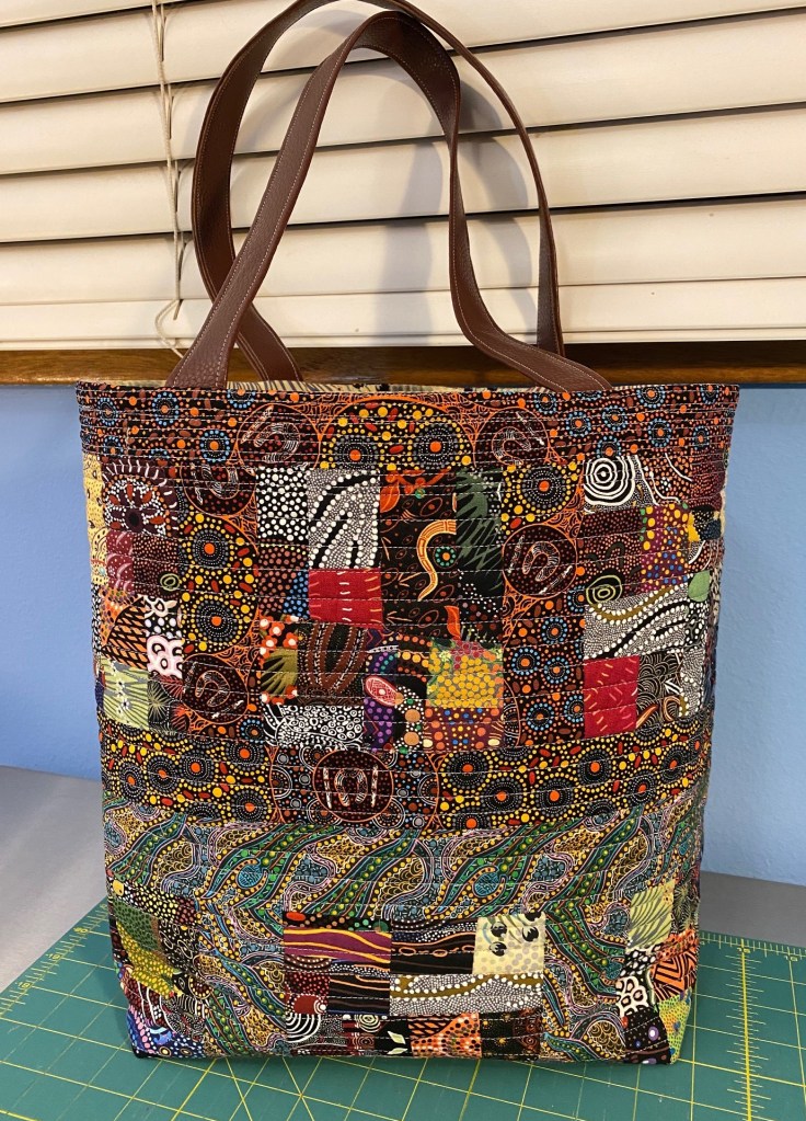 I finished up a couple of bags today. First up is this bag made from Aboriginal fabric scraps. I’m pretty happy with how this turned out.