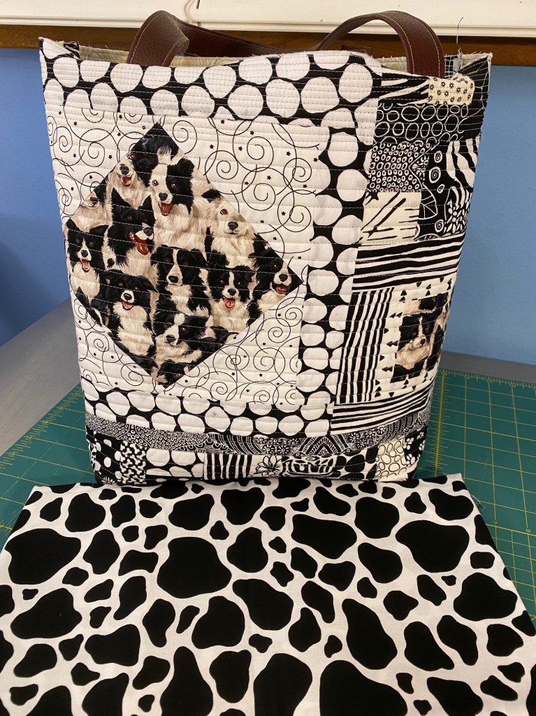 I also finished up the body of this second border collie bag. The pieced panels were already made. Tonight I made the quilt sandwiches, quilted the two panels, made the handles and assembled the outside of the bag. So all I have to do now is make the lining and sew it in.