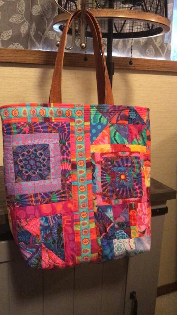 I made this from a charm pack of Kaffe Fassett paperweight fabrics that I’ve had for several years. I could never figure out what to do with it. One charm pack isn’t much fabric. So this was a perfect way to use up that little collection of fabric. I have enough left over to make another bag. Thinking of maybe going with a green paperweight for the borders on the next one.