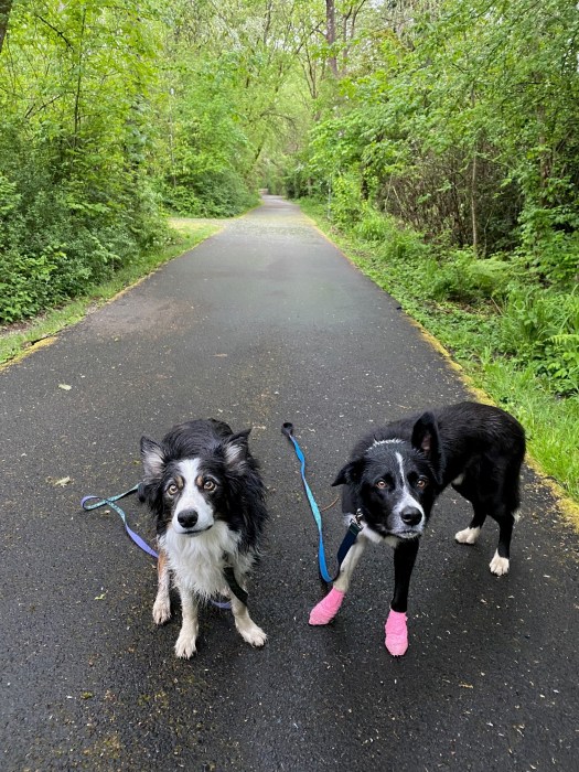 Luckily, he’s feeling sooooo much better today! Well enough to go for our walk this evening with his feet wrapped. He was very happy to get to go along.