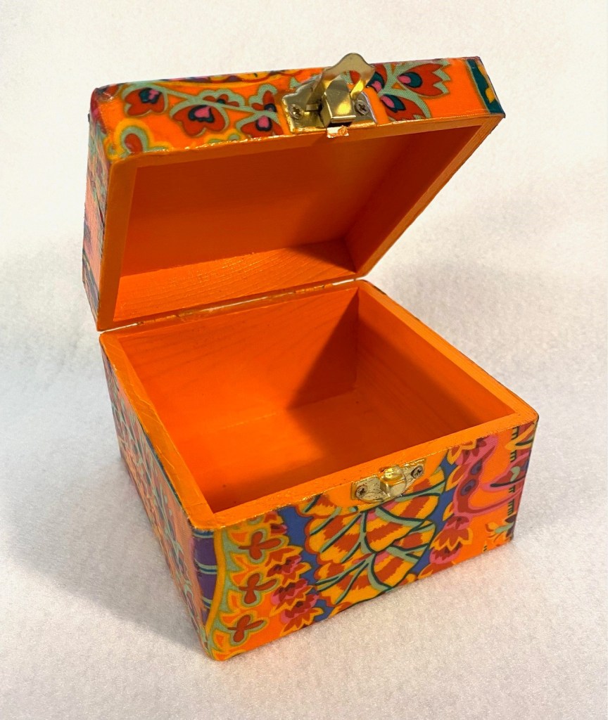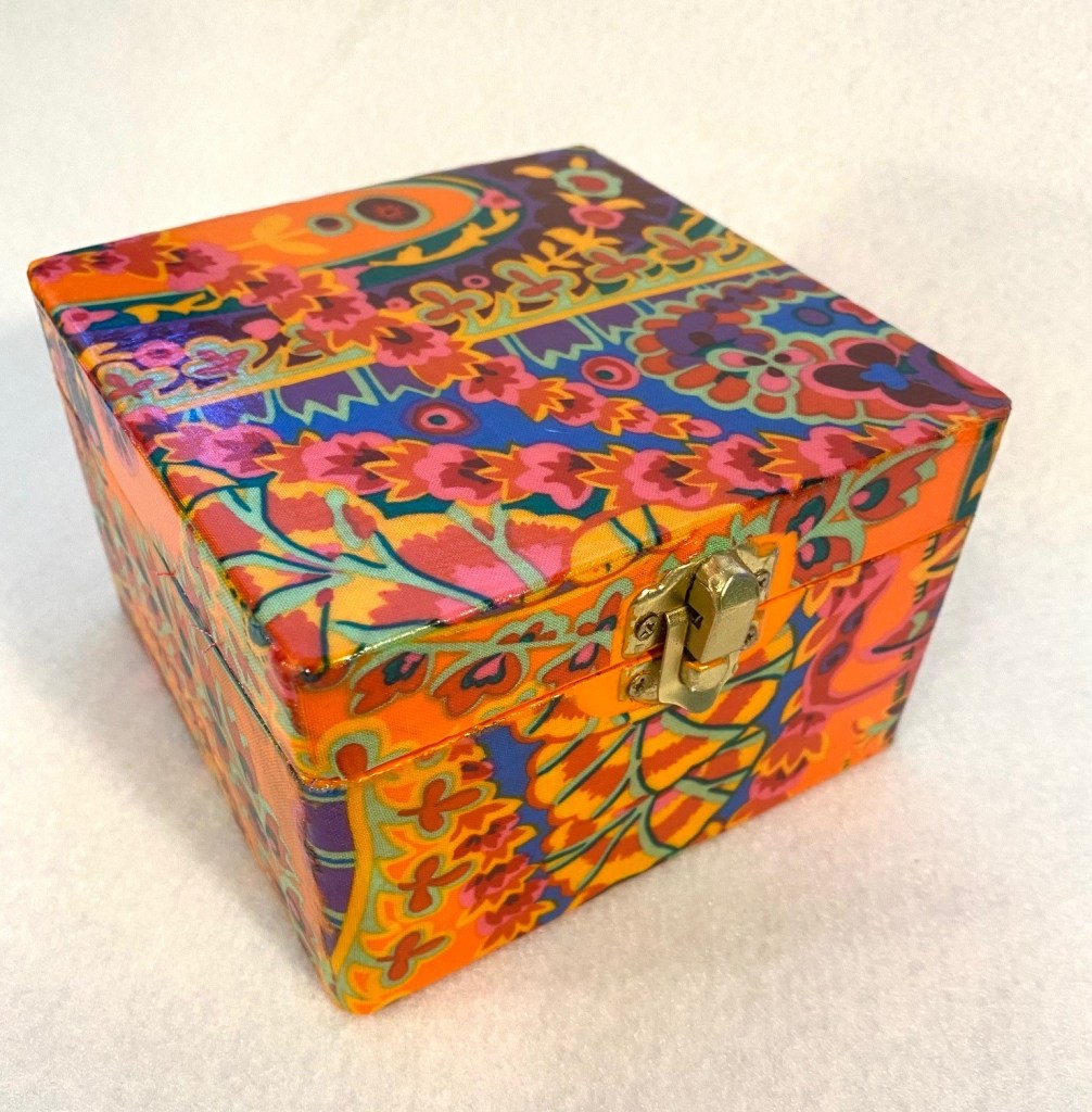 I had so much fun making the little tangerine Paisley Jungle covered box that I decided to strike out on another one tonight. I have a couple more boxes in my craft closet and selected one that is just like the orange one, except it’s about 2 inches bigger.