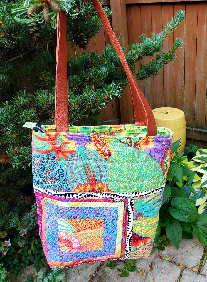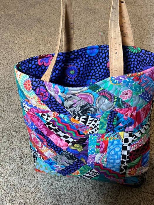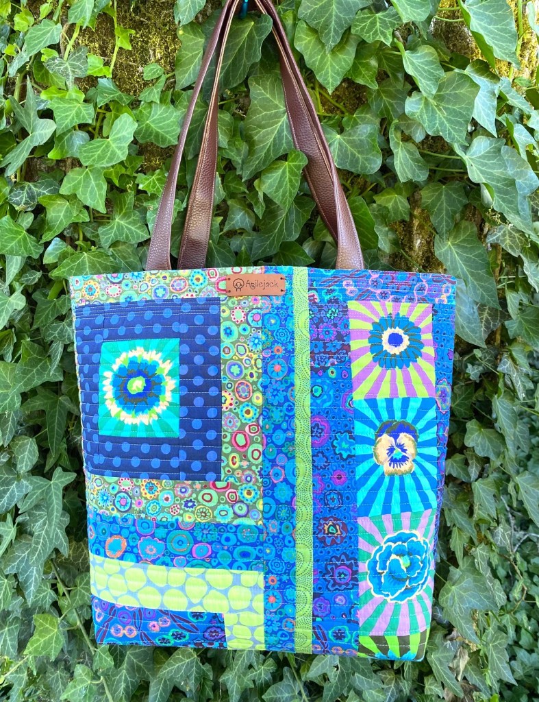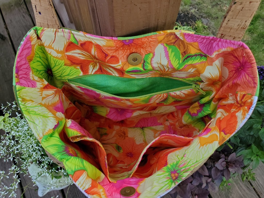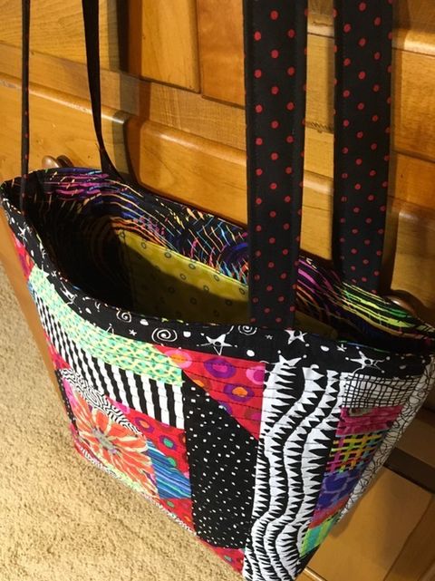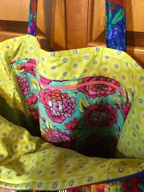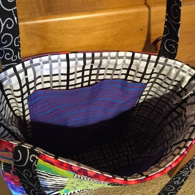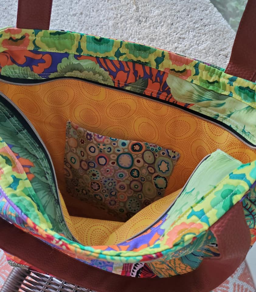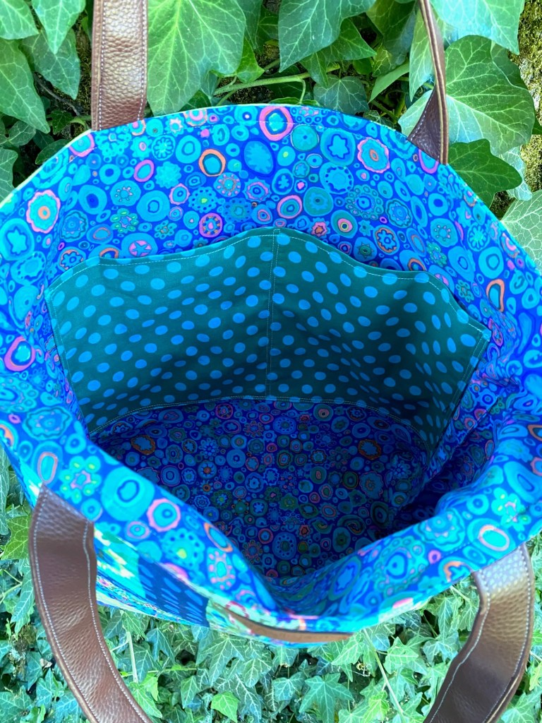 Here’s a sweet and comfy bag from Linda Allen. I love the eclectic and scrappy feel of this bag. It feels like a well loved and comfy quilt. I love the larger pieces of big prints she’s used, and I really love that she really went for it with a gorgeous lining of brassica! Love it!
