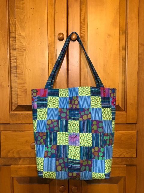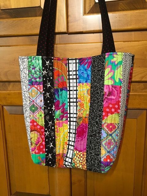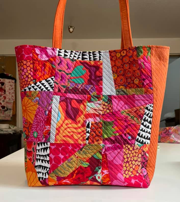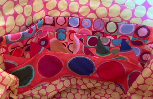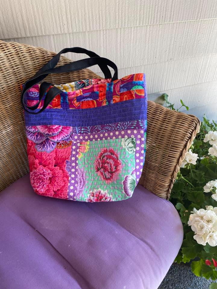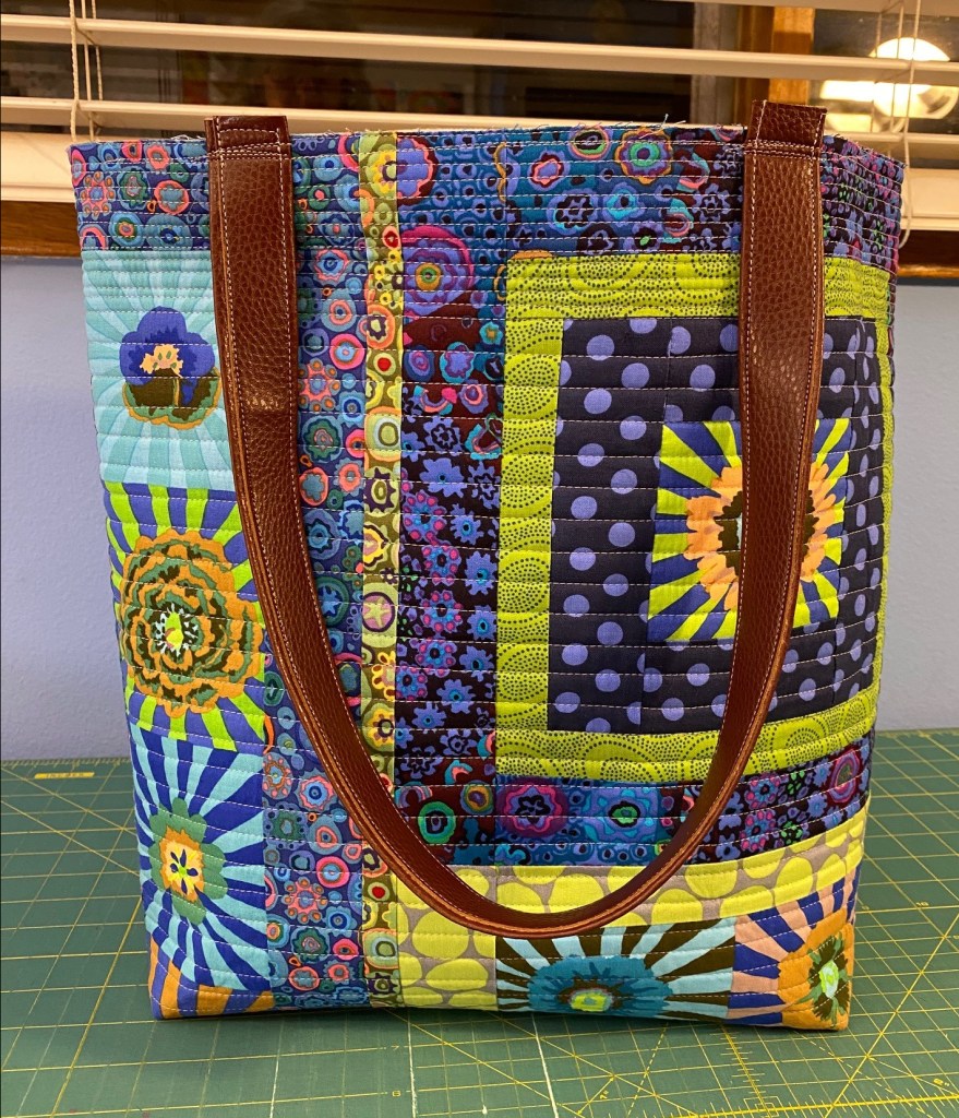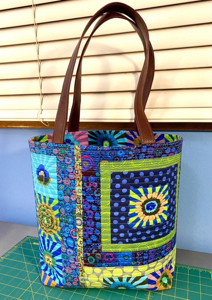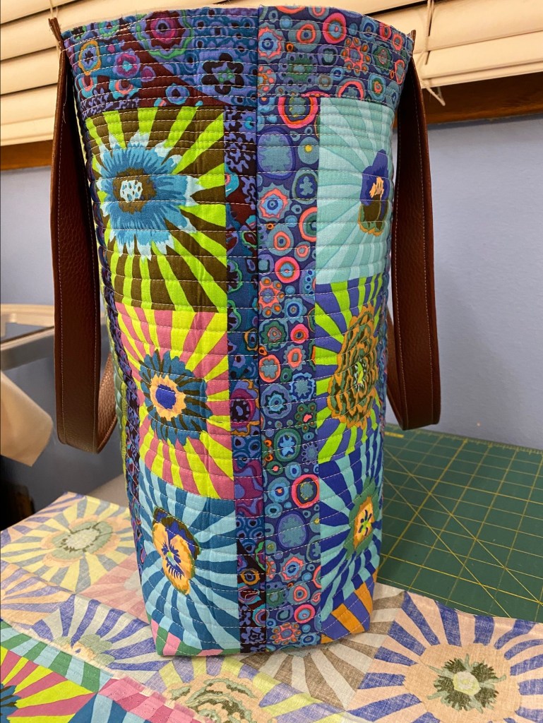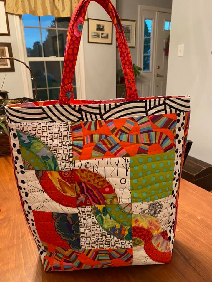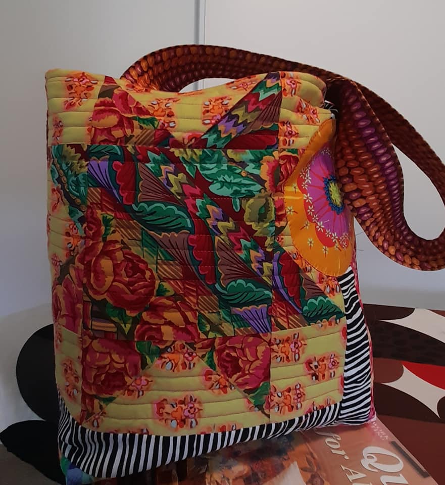 Here’s a sweet and comfy bag from Linda Allen. I love the eclectic and scrappy feel of this bag. It feels like a well loved and comfy quilt. I love the larger pieces of big prints she’s used, and I really love that she really went for it with a gorgeous lining of brassica! Love it!