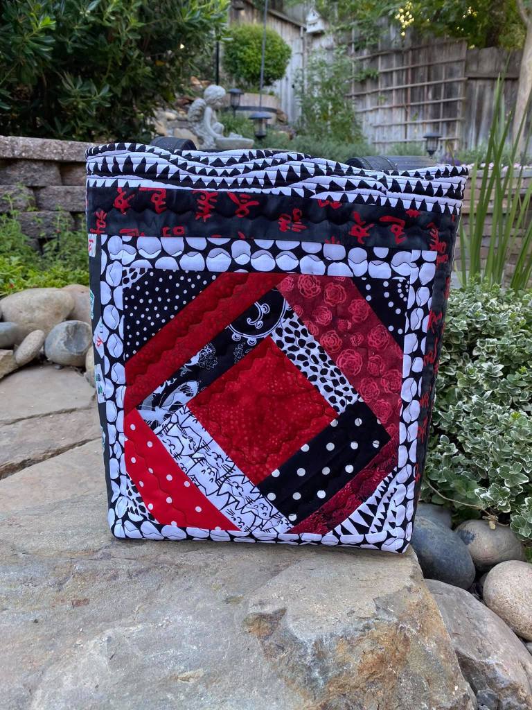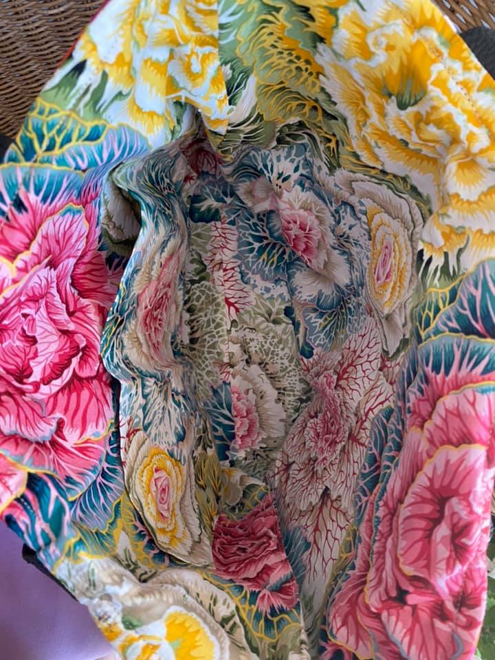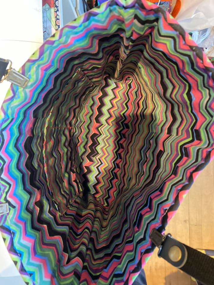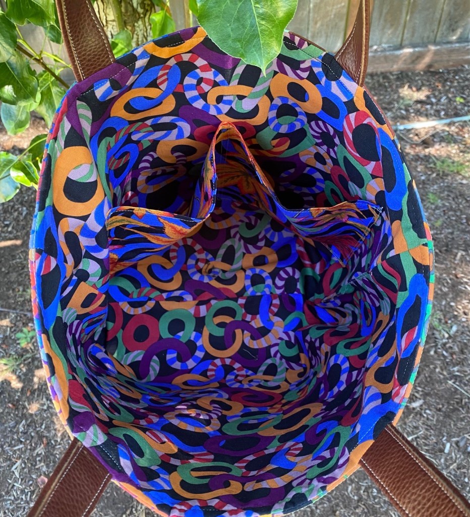 Next up is Cherry Naylor. She’s made a few of these bags and this one is a good one! I love the black and white fabrics she used, and the large iris print is so good!!! And that lining… well, it’s pretty spectacular! I love this bag!!!