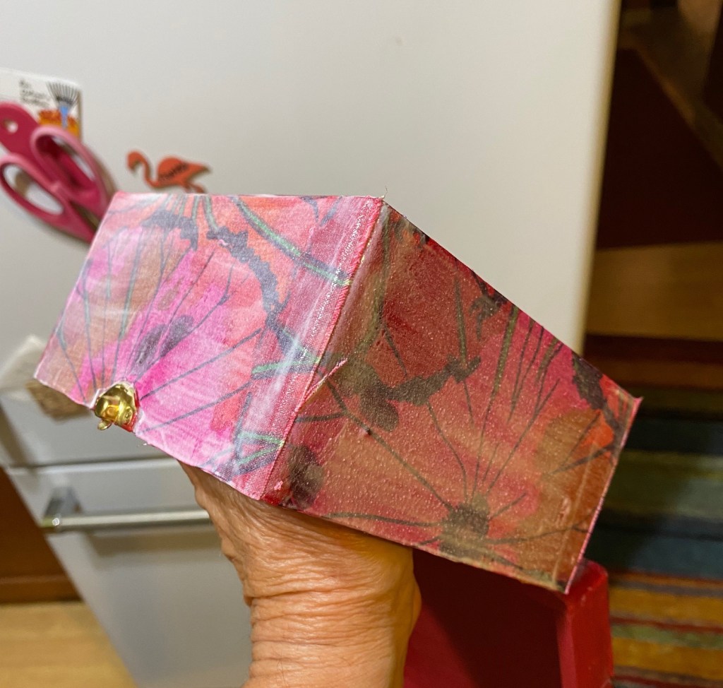 I pulled out some red acrylic paints and selected one that works well with this fabric and got the inside and outside of the box painted in several sessions during the day, letting each coat dry nicely in the sun.