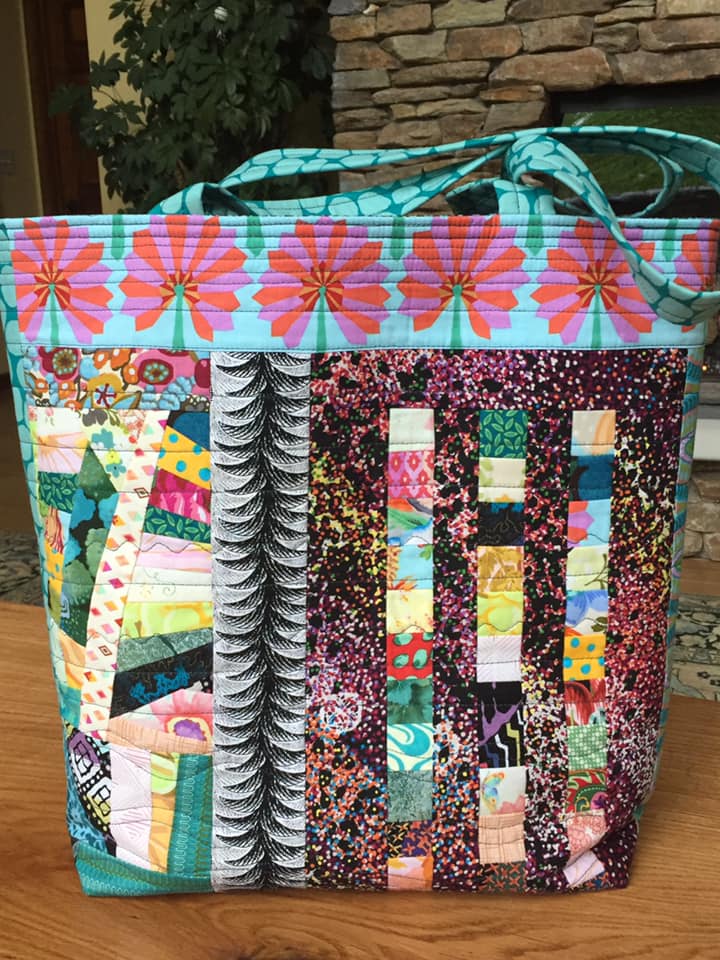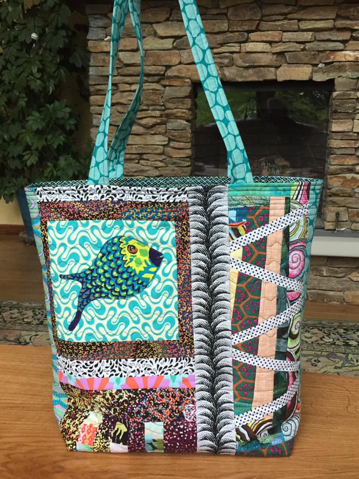 Got some photos of a really cool bag from Amy Bell Buehler. And I just LOVE this bag! That little fish is so fantastic. And I love the earthy colors, fun crumb piecing, and those wonderful pops of turquoise here and there. This is just such a winner! Nice job Amy!