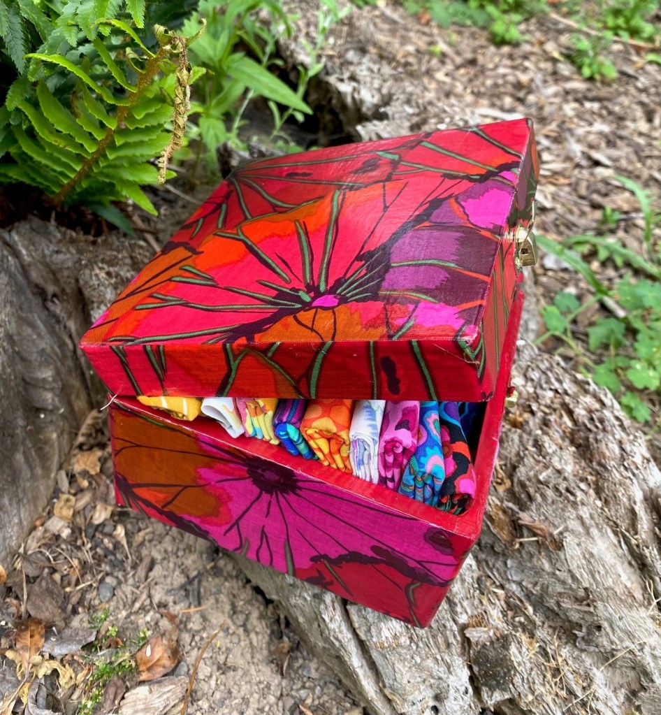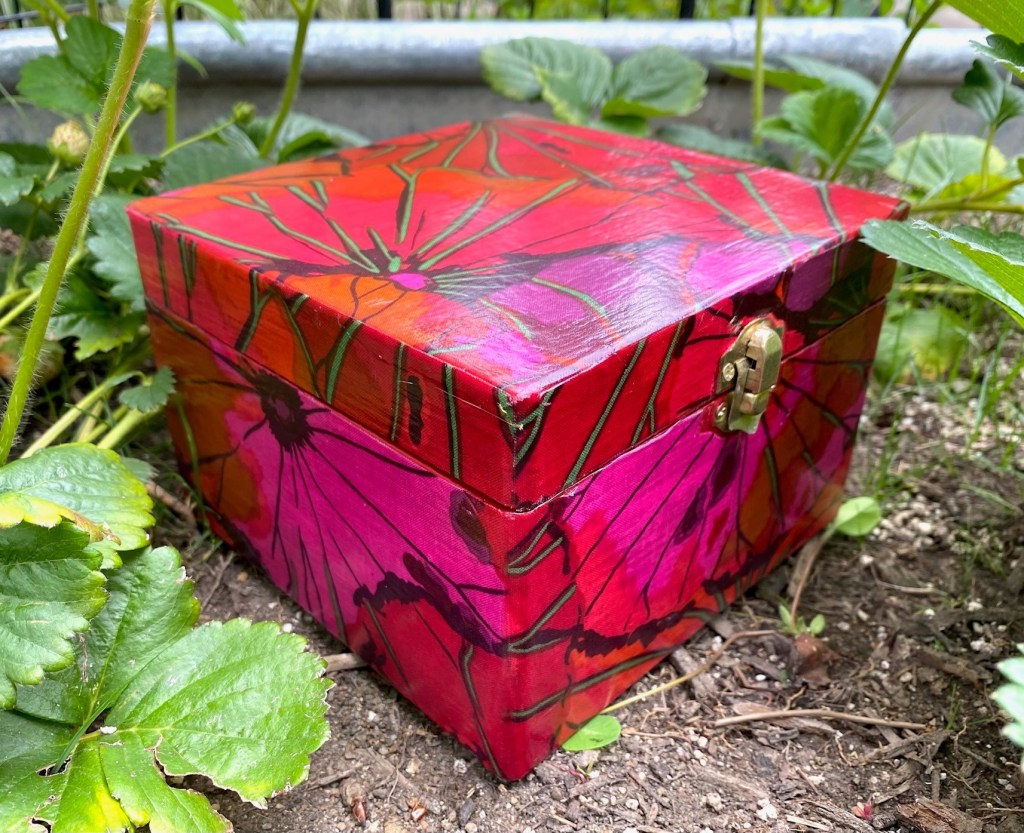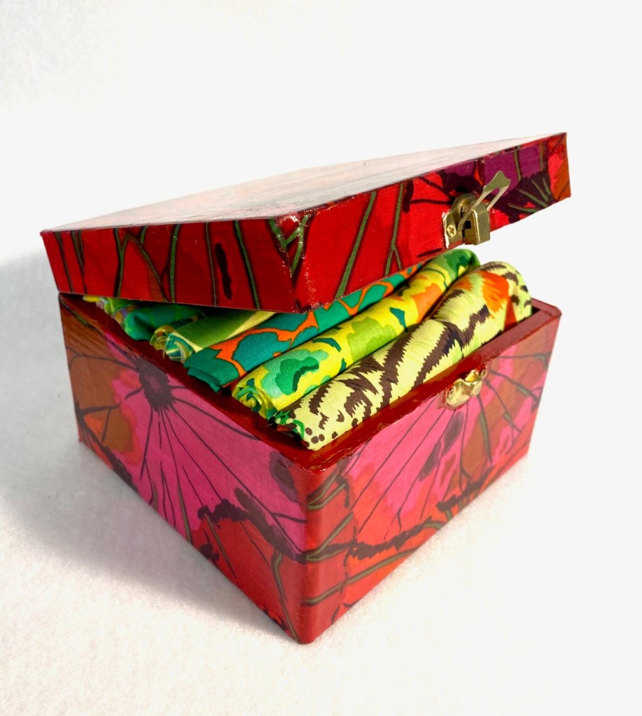 I finished getting the fabric applied to this box last night and was able to get several coats of Mod Podge on before I went to bed. And then today I took some short breaks from work to get it sanded and to apply several coats of spray sealant. And now it’s done.