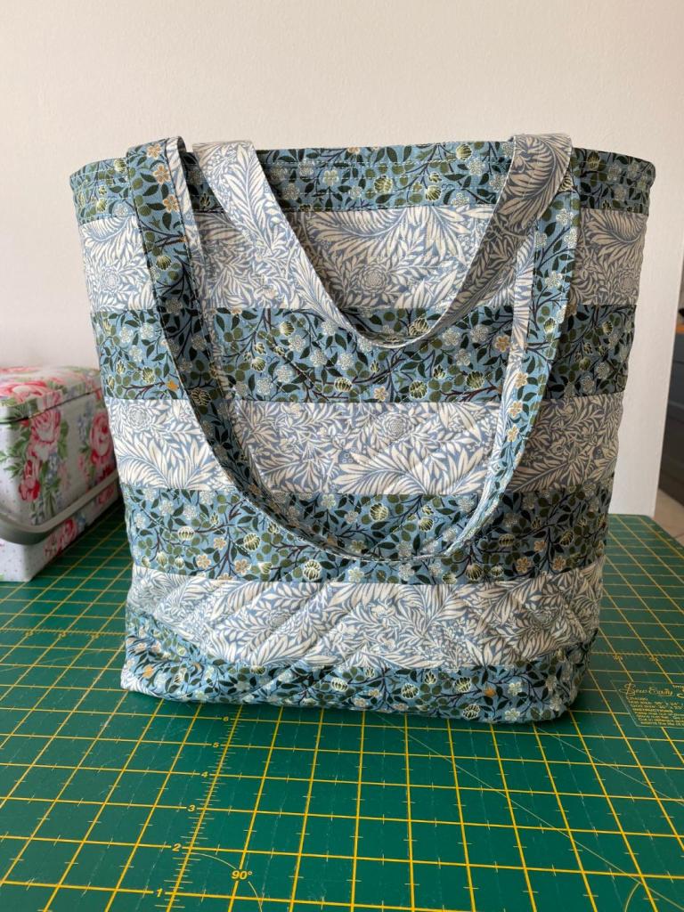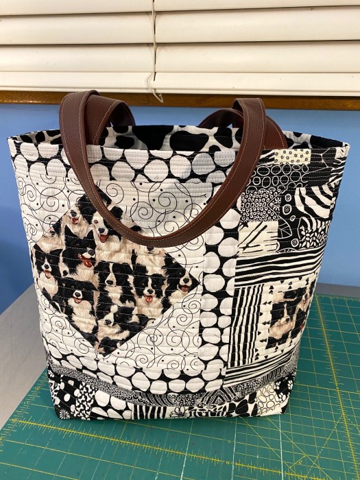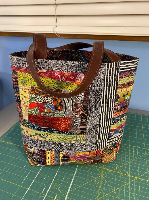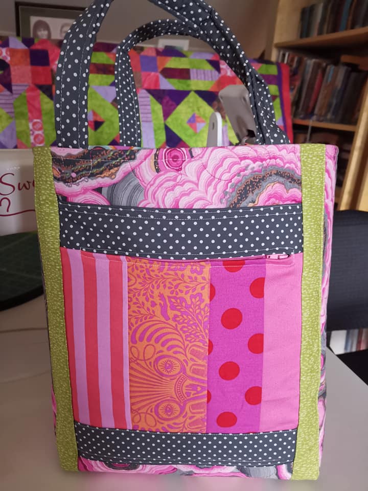 The last bag tonight is from Ann Baird. I love the way she used the wide vertical stripes of fabric. It’s a simple construction but it’s graphically strong.