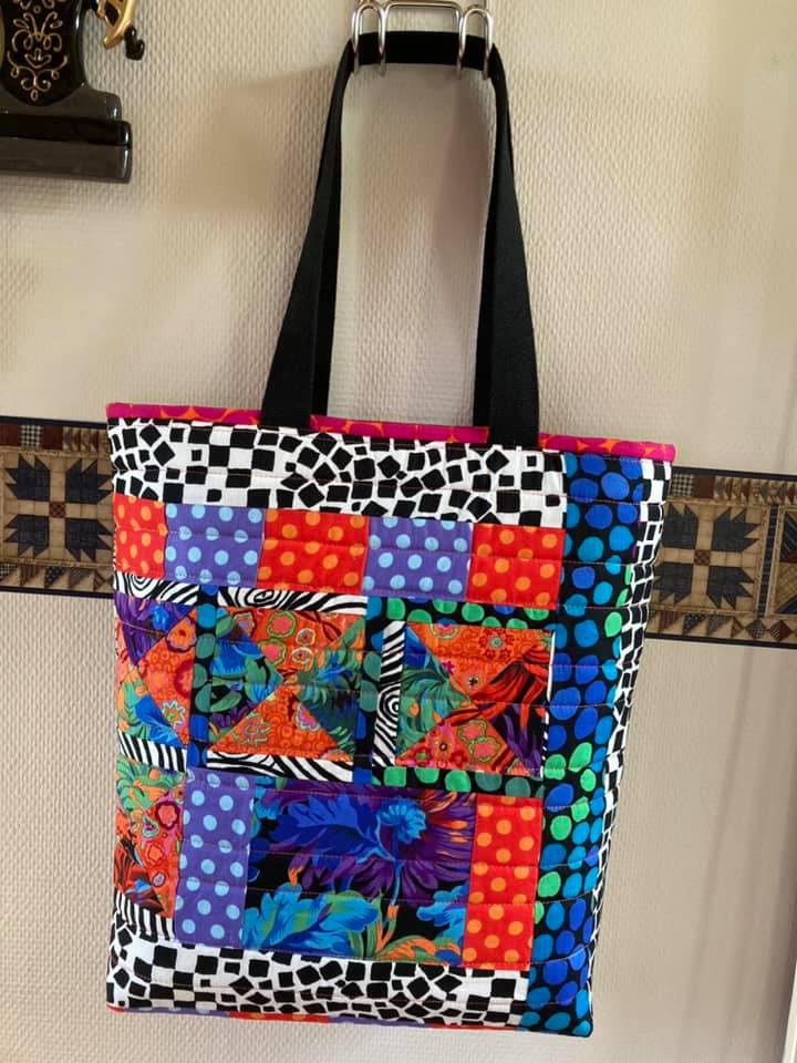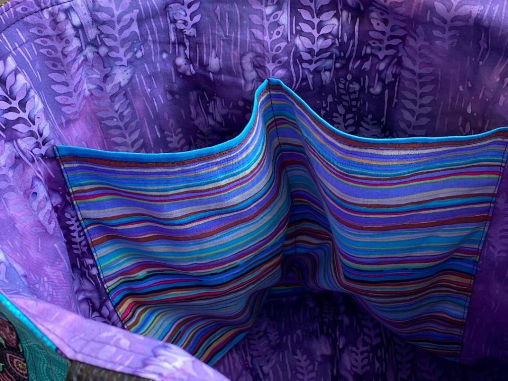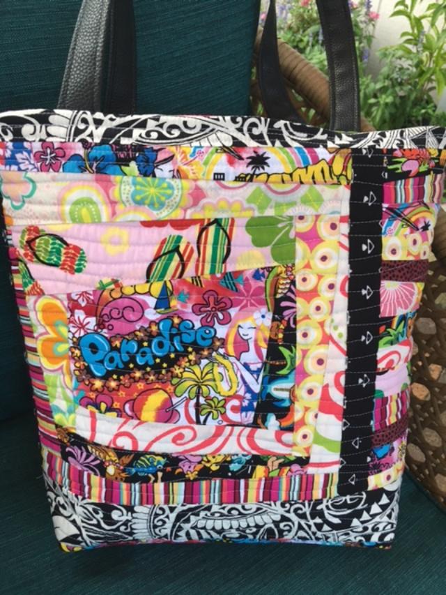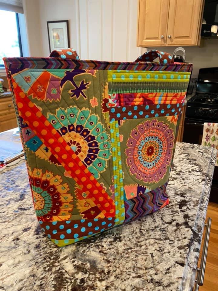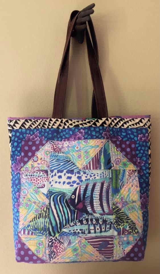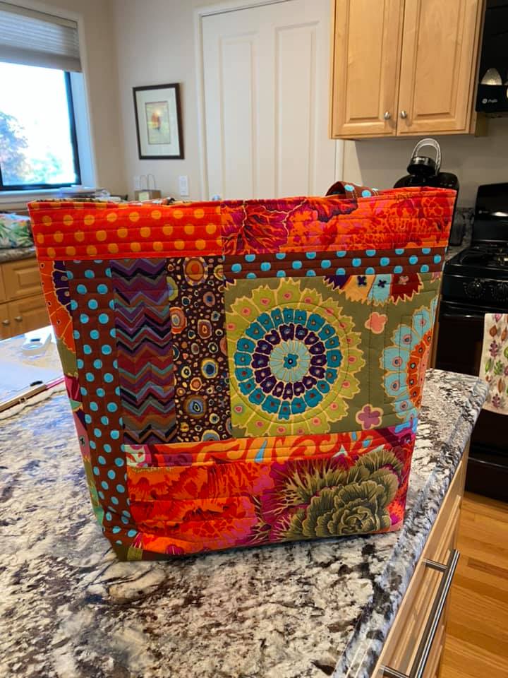 This next bag was made by Jody Soberon. She calls it her Murphy’s bag. Because like Murphy’s law, everything that could go wrong did go wrong! It looks to me like it turned out pretty well! I really like the cool, watery colors on that block on the front.