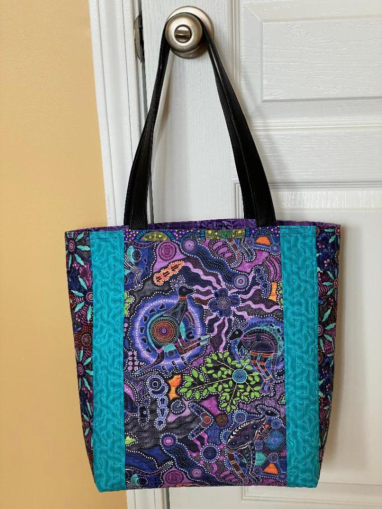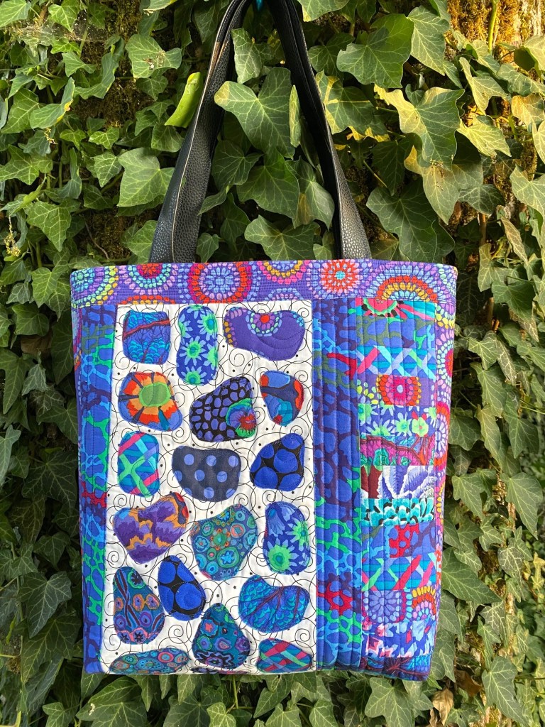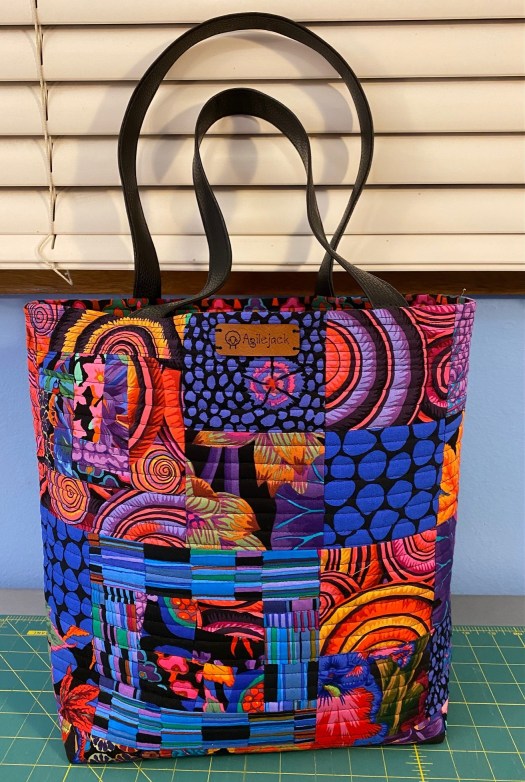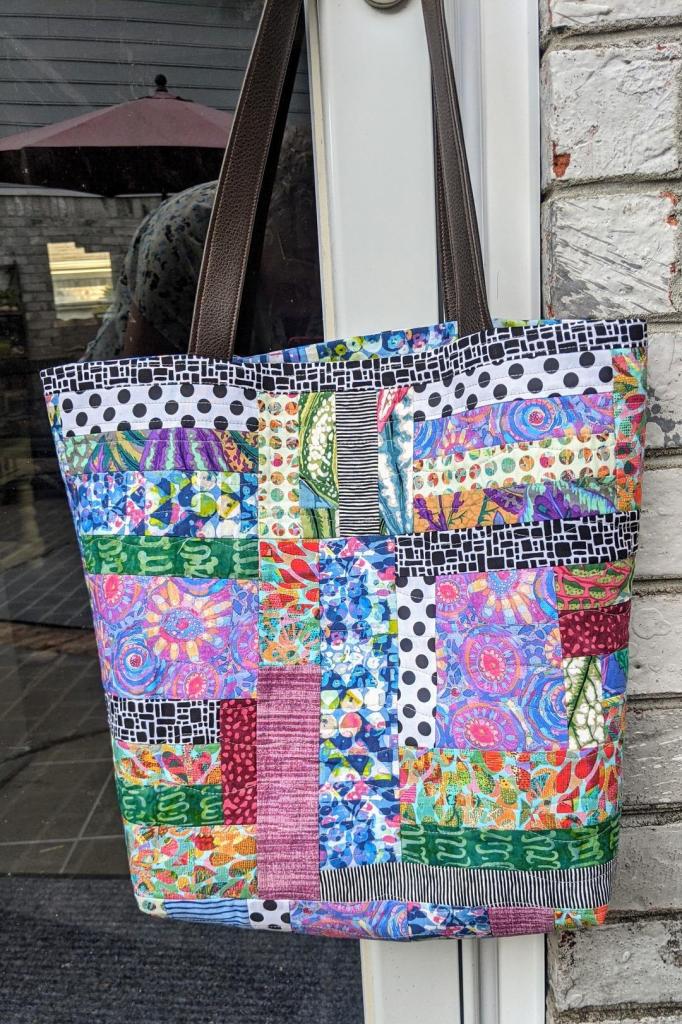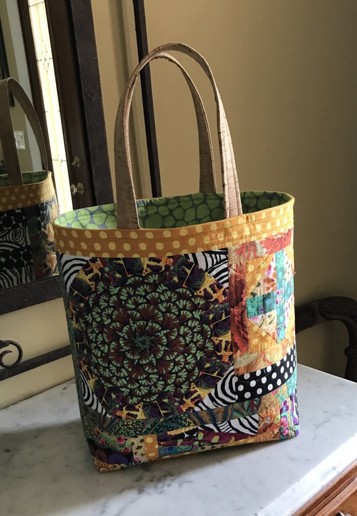This next bag was made by Jody Soberon. She calls it her Murphy’s bag. Because like Murphy’s law, everything that could go wrong did go wrong! It looks to me like it turned out pretty well! I really like the cool, watery colors on that block on the front.