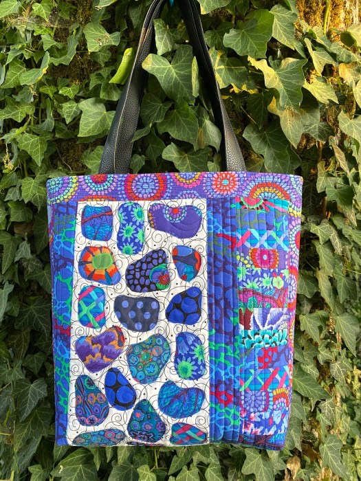 Lots of Frankenbags from blog readers since I posted last. The first one is from Sharon Markum. And it’s so cool! I’ve seen the quilts with those sort of blobby floral applique and I love them. the cool colors on this one are really lovely! I just lvoe those turquoise and grey fabrics together!