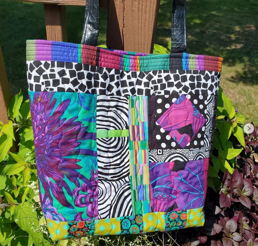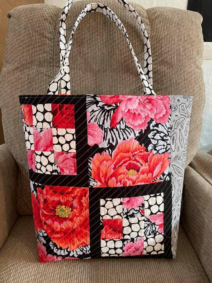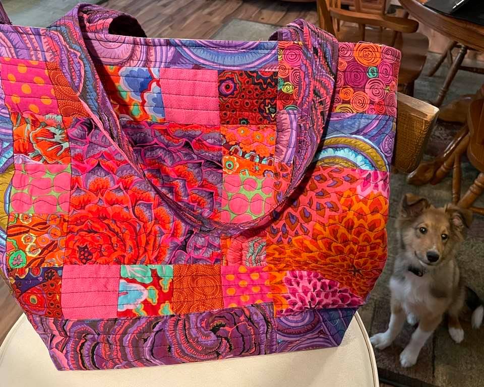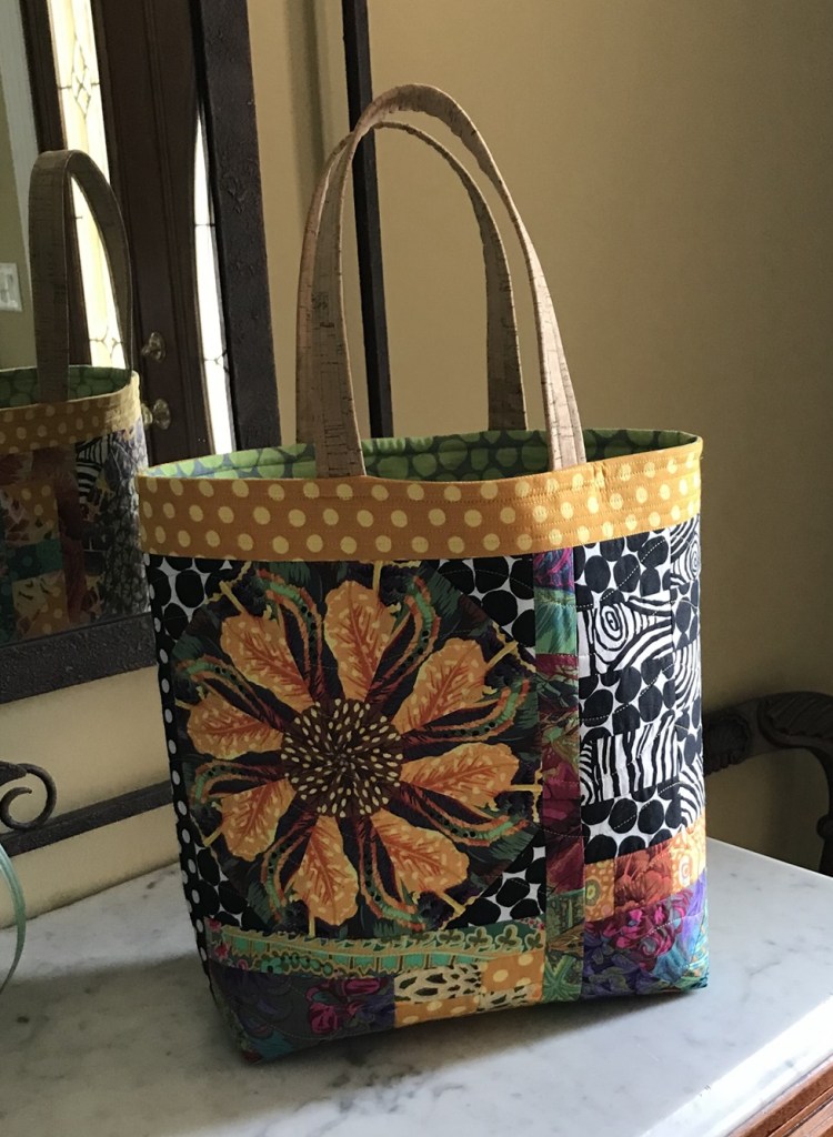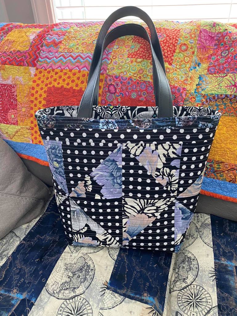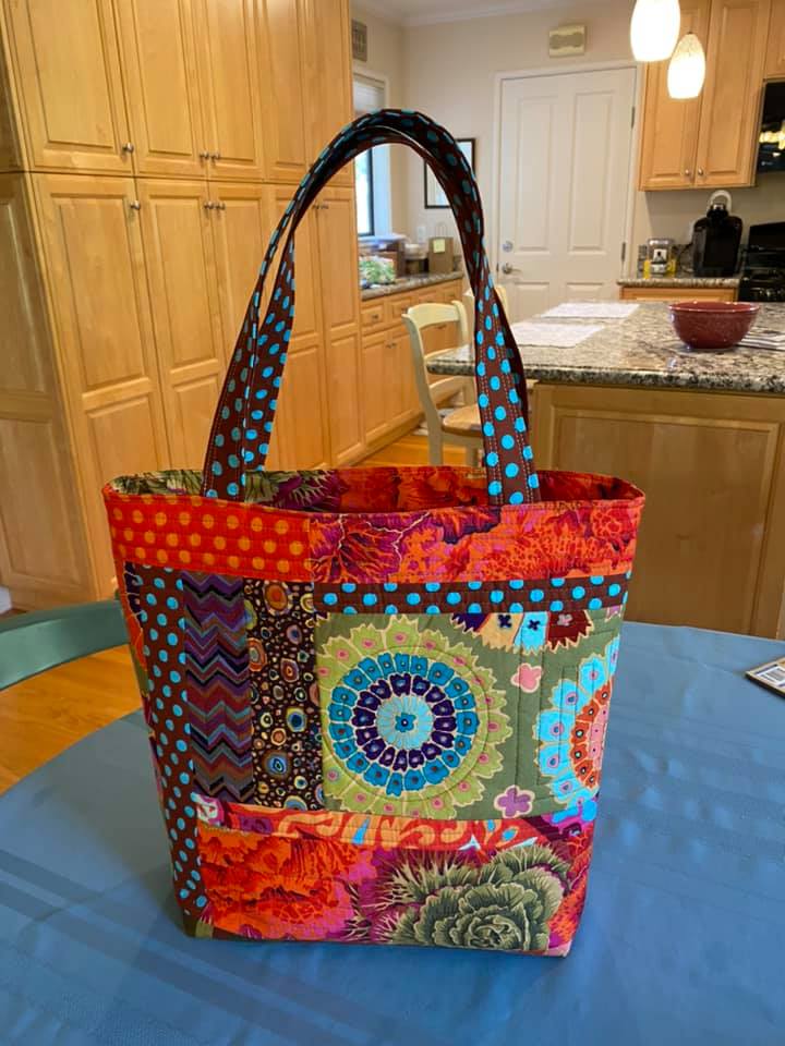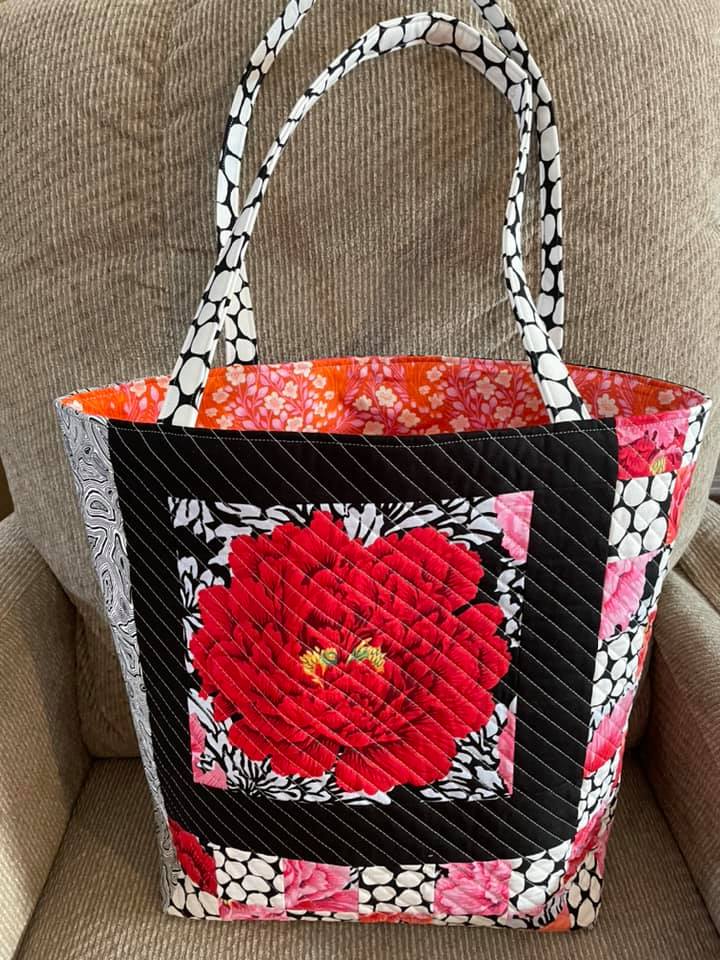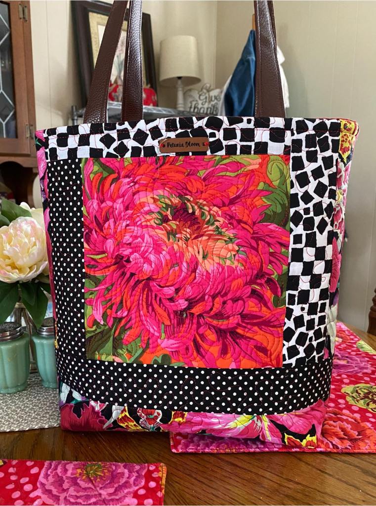 The next bag is another one made by Sharon Marcum. Another great use of a big old bloom! I love the saturated blues in this bag. I also love the limited selection of fabrics. It’s a good look!