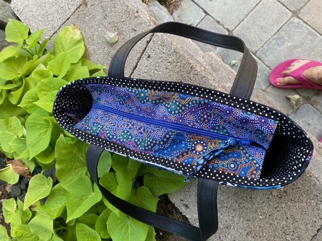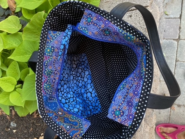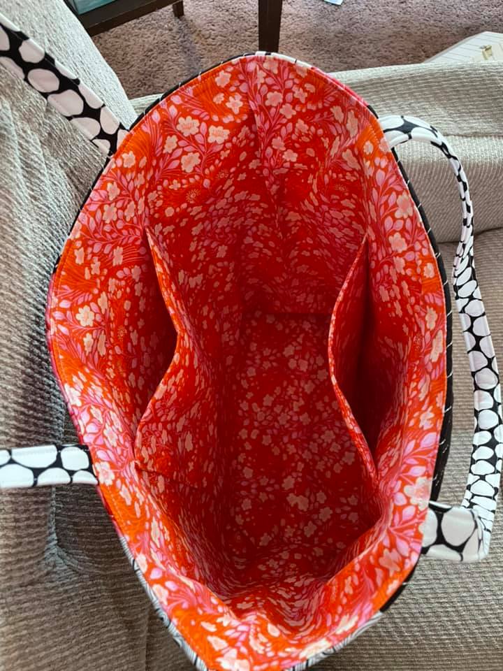 the next bag is another one by Birthe Aust. She’s made a good number of these bags. And I love that big shaggy bloom on the front of this bag. And the red polka dogs are so sweet. She’s also put a really strong lining in this bag… which makes me so happy!