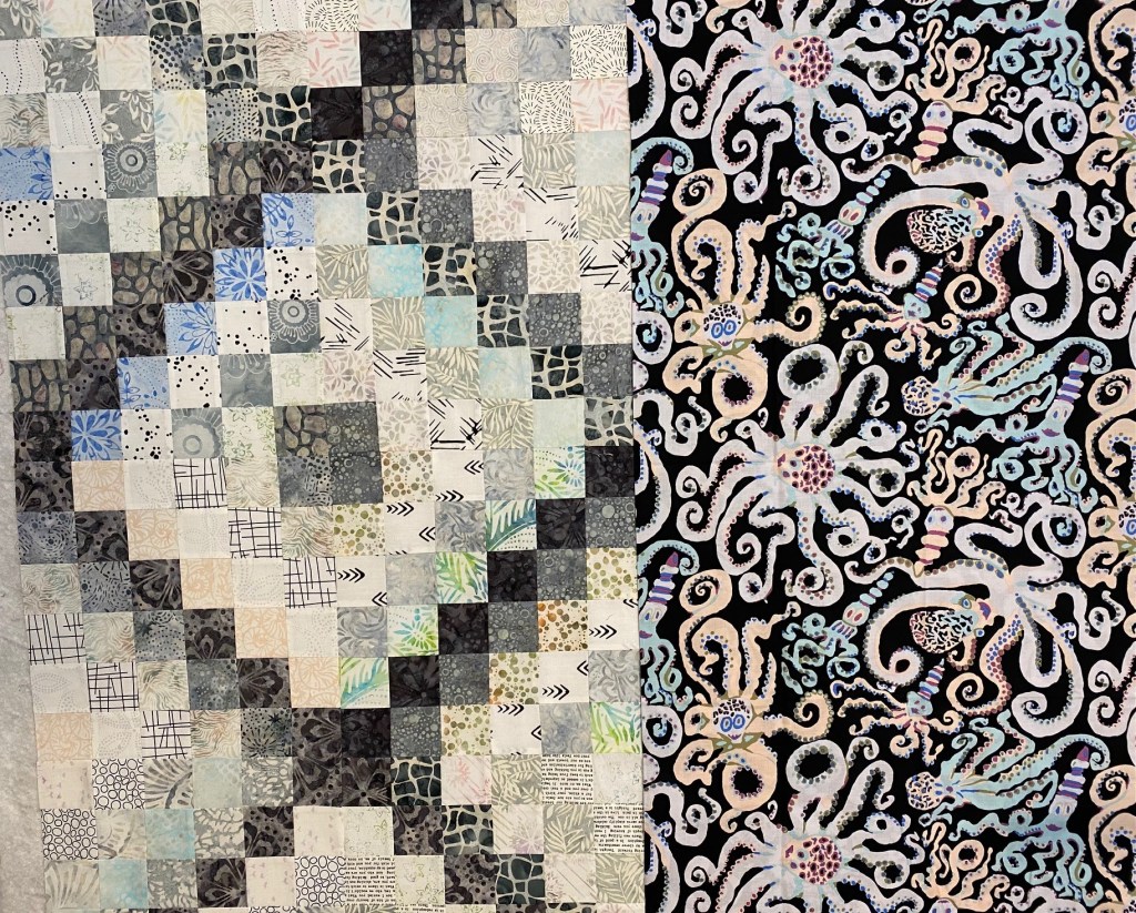 I sewed another row of my Ice Storm quilt together and sewed it to the first row. A friend of mine suggested that I use the black octopus fabric I bought recently as that backing for this quilt. What do you think?