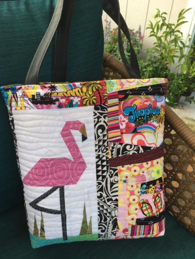 The next bag is from Rebecca Caisse. I just love that little paper pieced flamingo. Makes me think I may need to use up some of the bird blocks I made a number of months ago. And all her scrappy fabrics are really fun and vibrant!
