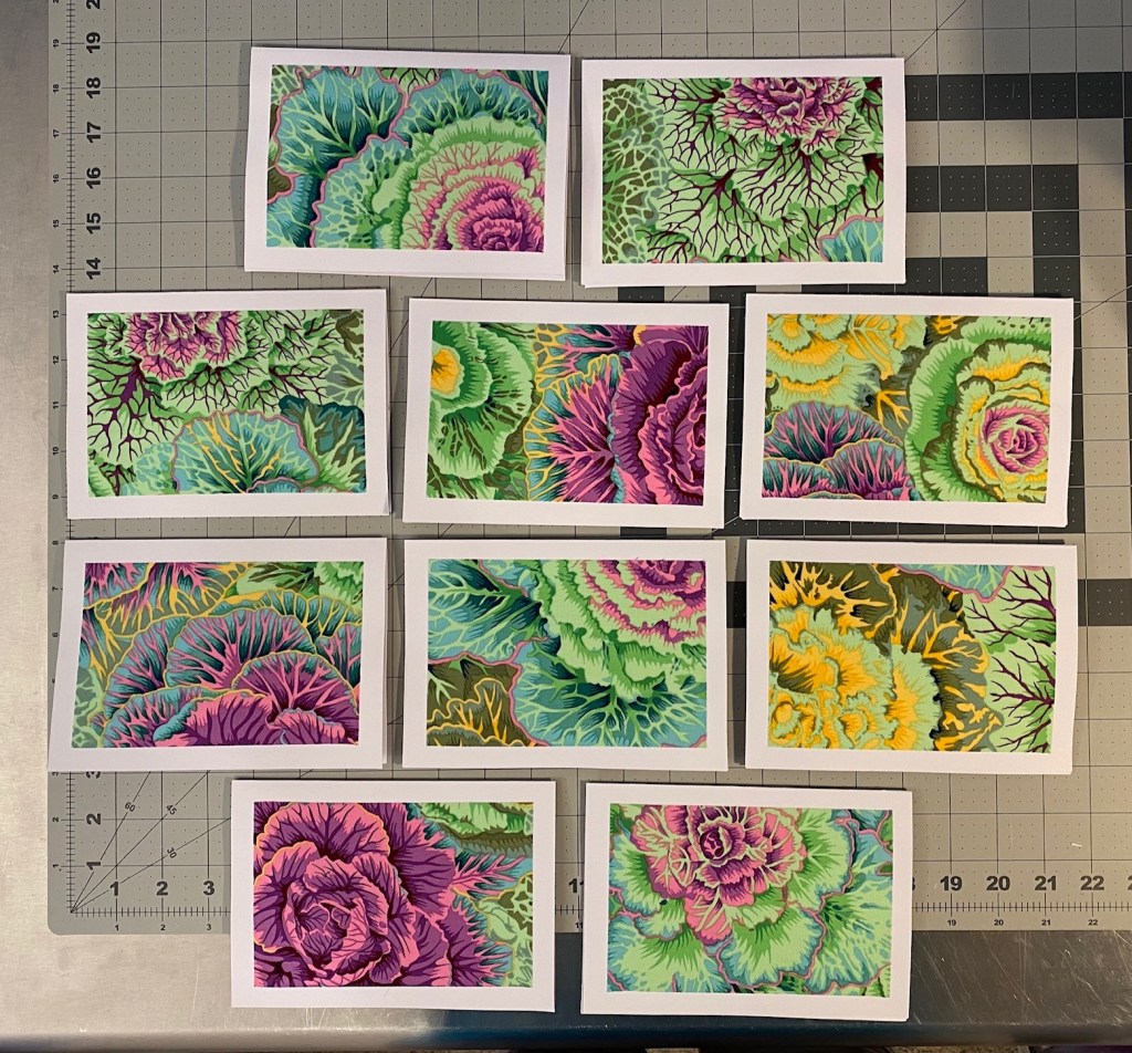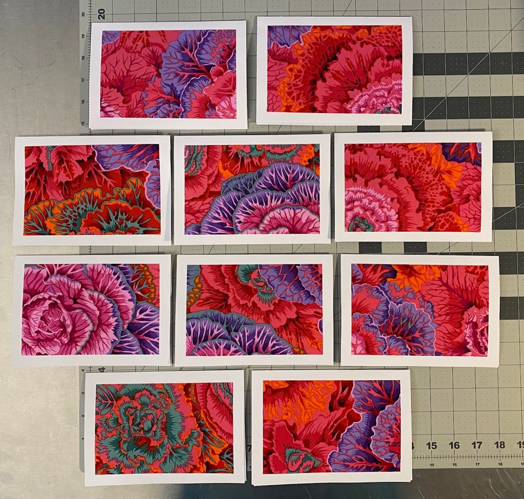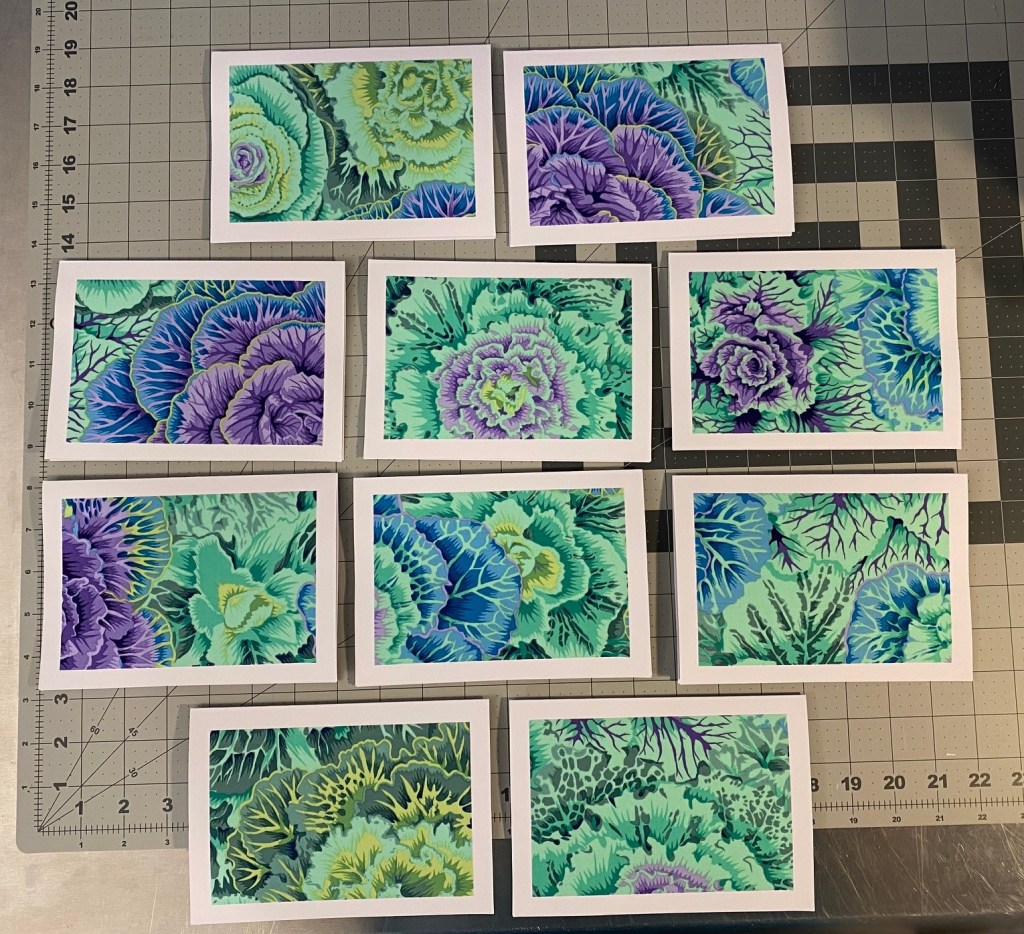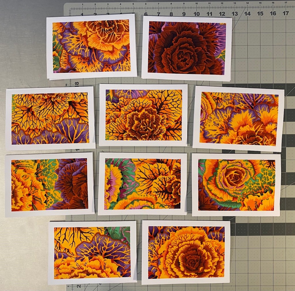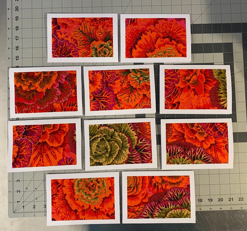 I decided that I’m going to make some card sets from ten different color ways of Philip Jacobs’ brassica. Tonight I got all the fabric cut and prepared with Heat and Bond and ready to be cut for cards.