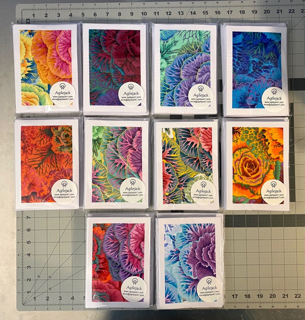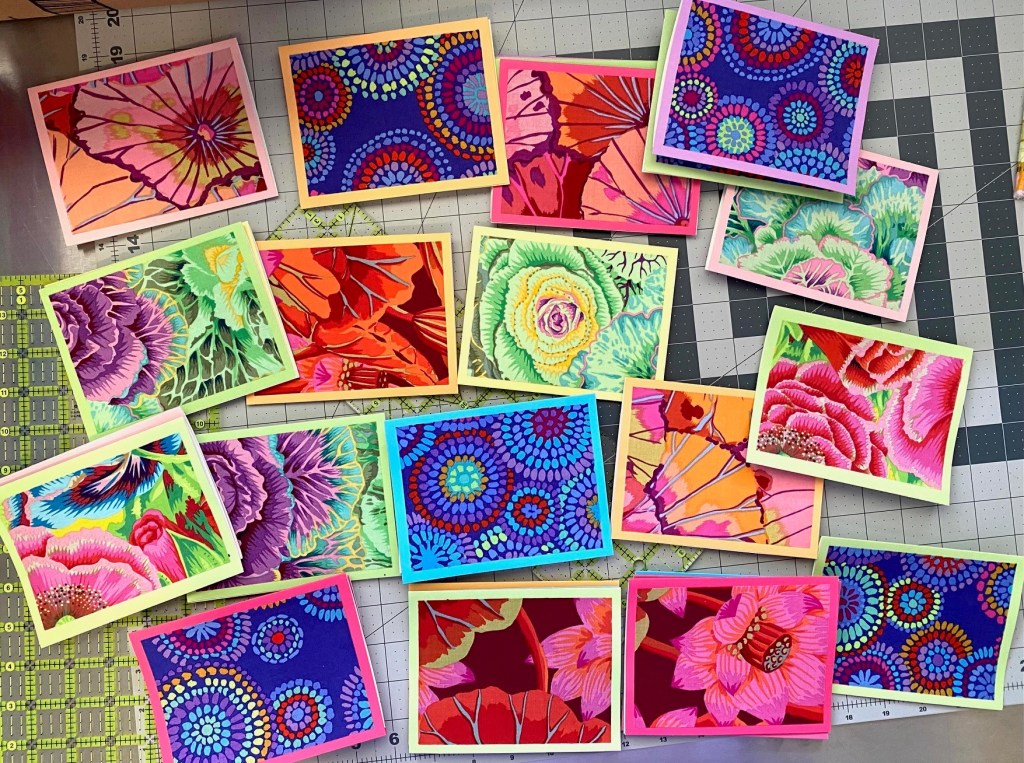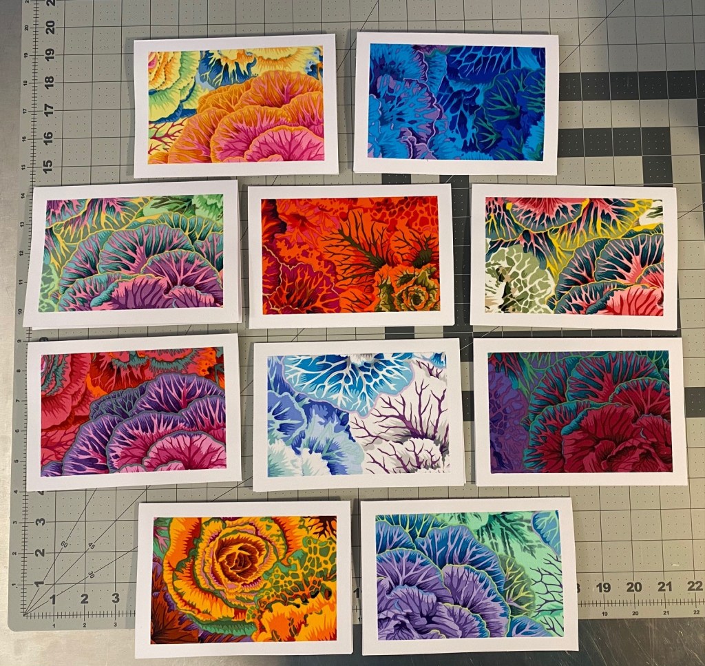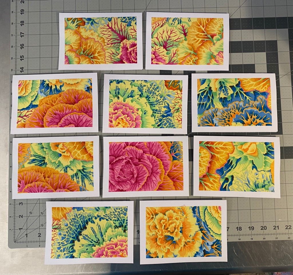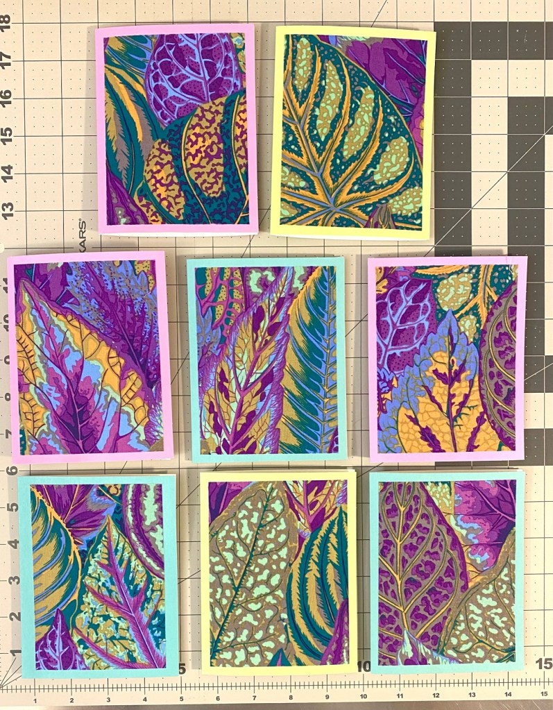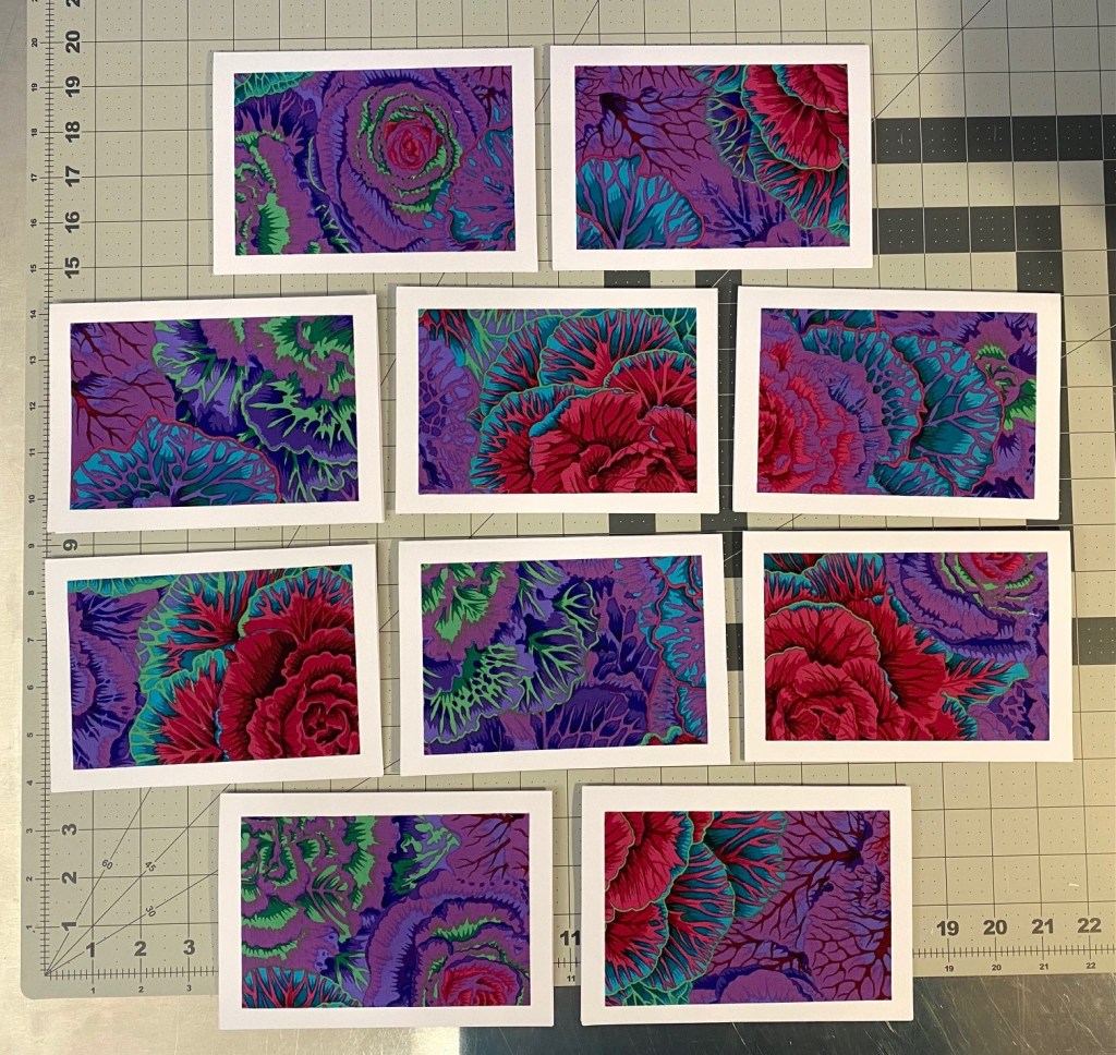 I decided that I’m going to make some card sets from ten different color ways of Philip Jacobs’ brassica. Tonight I got all the fabric cut and prepared with Heat and Bond and ready to be cut for cards.