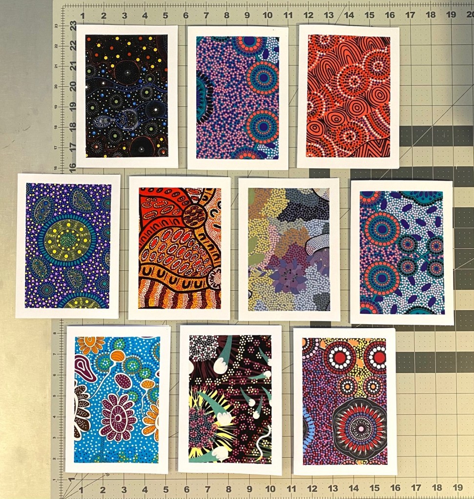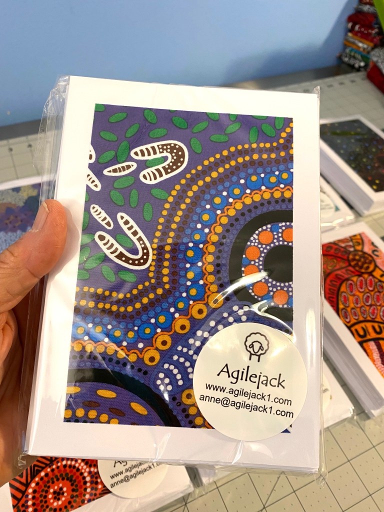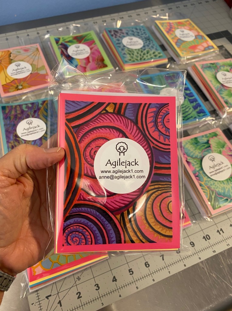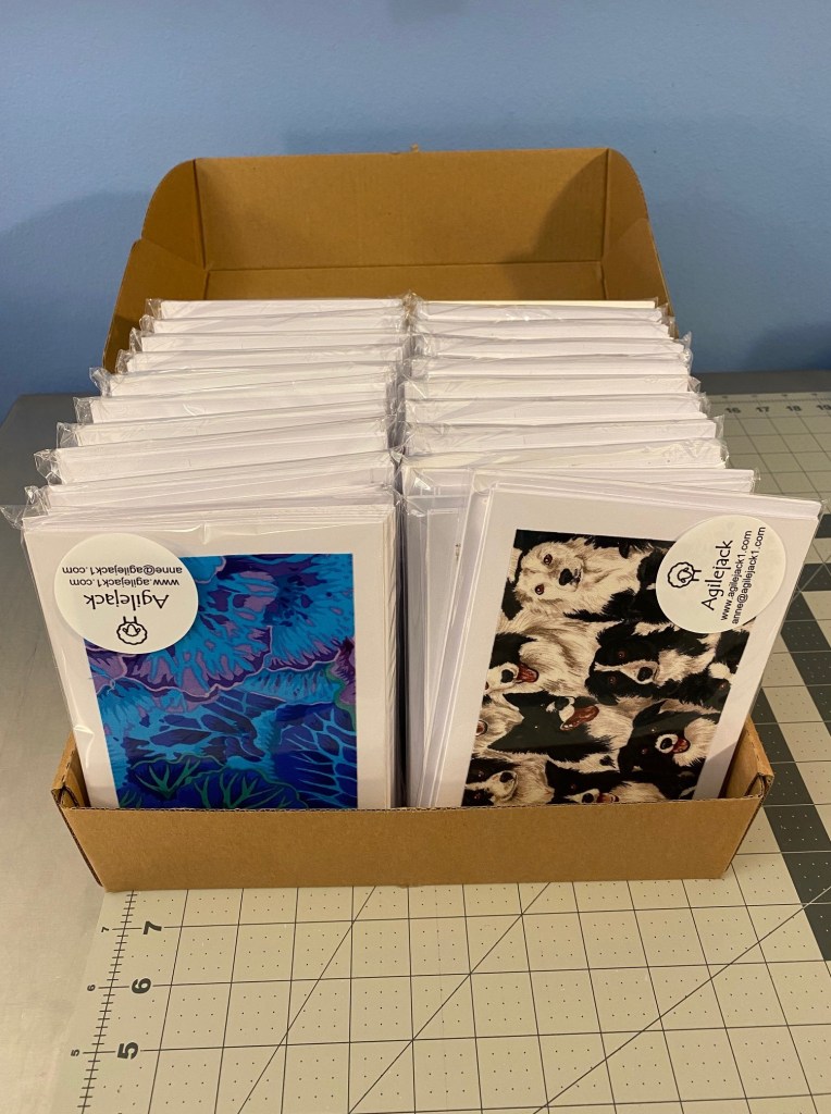 I did accomplish SOMETHING this weekend. I finished up more than 80 cards made with Aboriginal fabrics and got them all packaged up. Here’s cards showing the different fabrics I used for these cards.