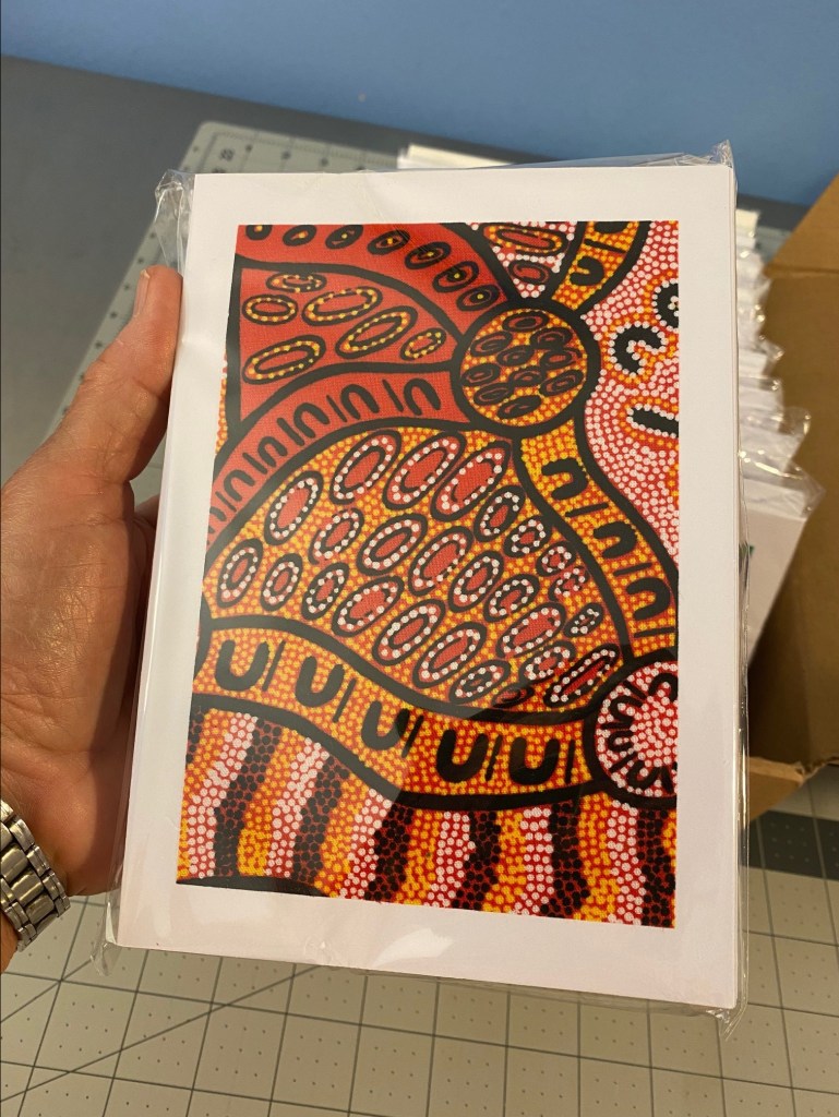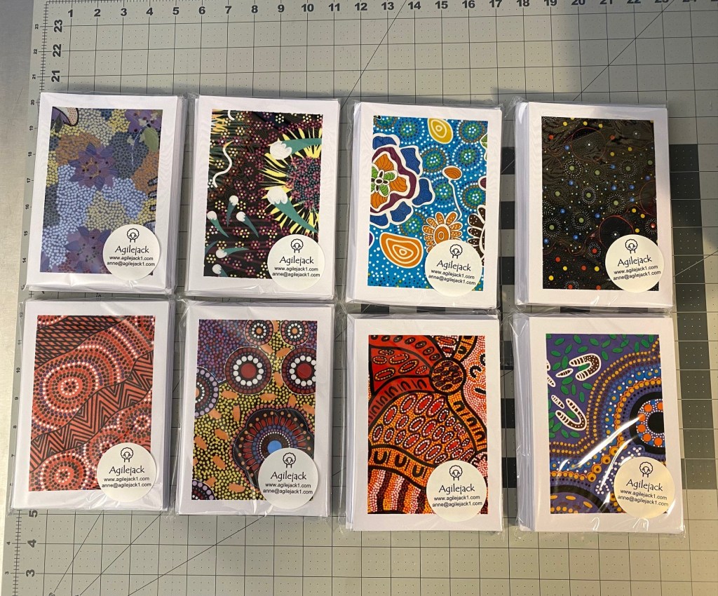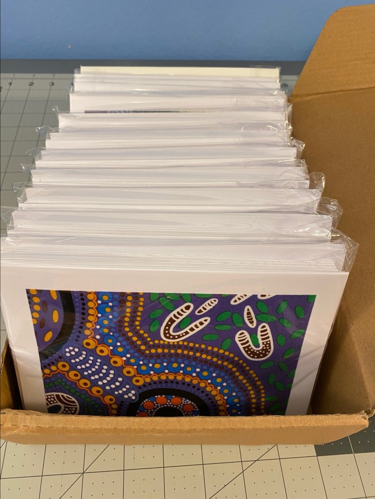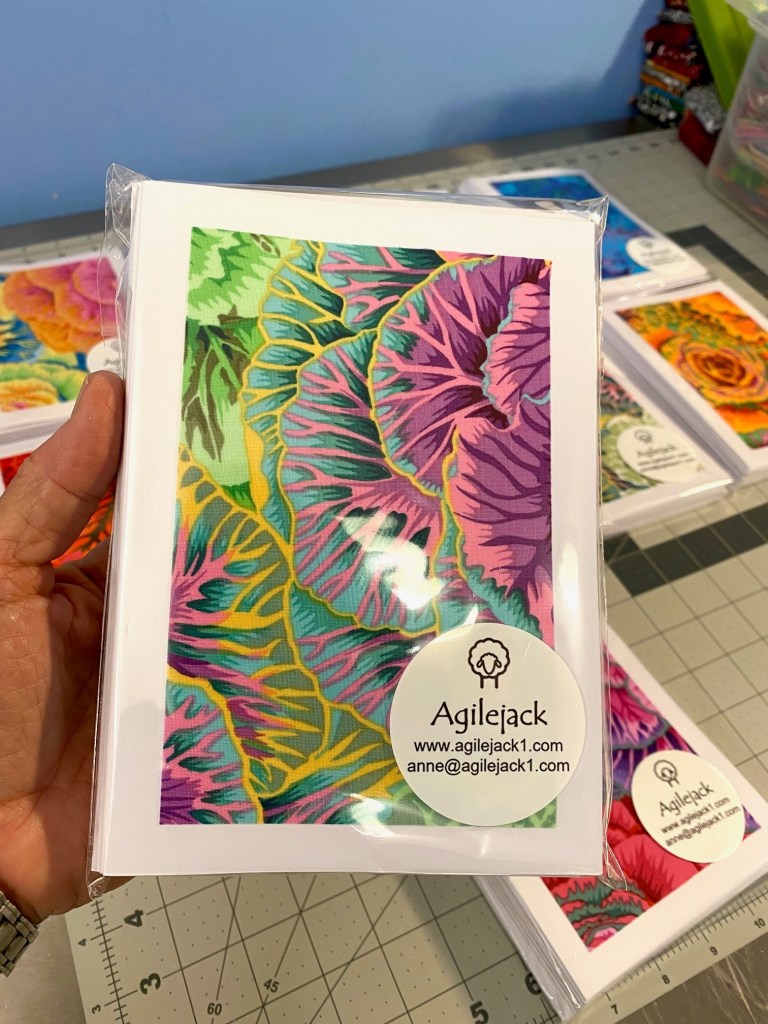 I did accomplish SOMETHING this weekend. I finished up more than 80 cards made with Aboriginal fabrics and got them all packaged up. Here’s cards showing the different fabrics I used for these cards.