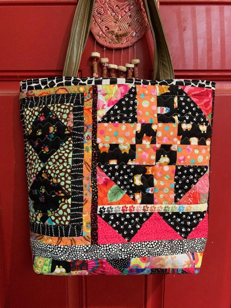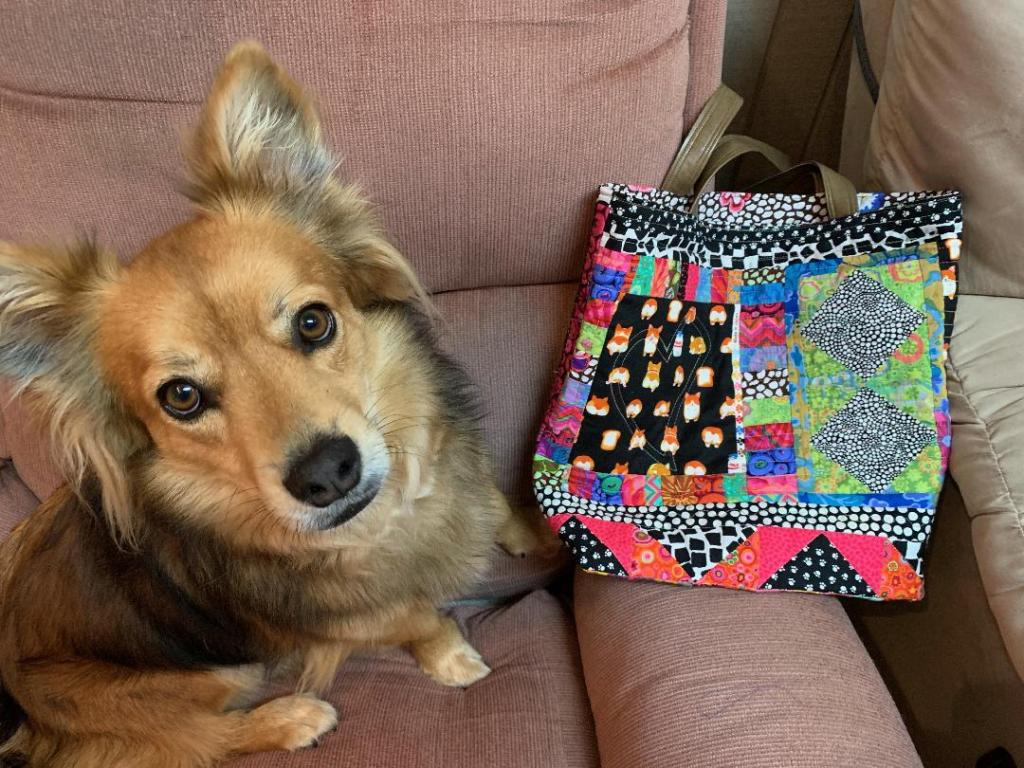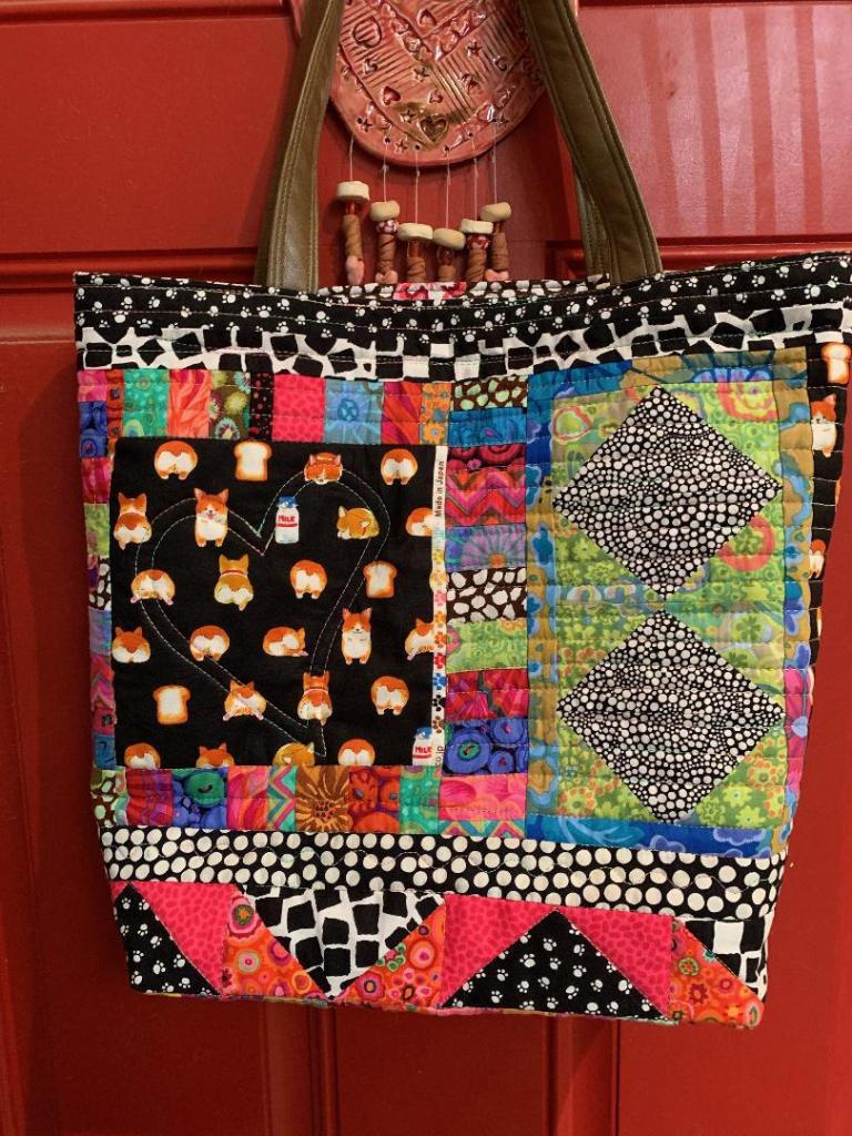 This next bag was made by Aimee Kaneko. She had seen the bag I made with corgis and wanted to use some corgi fabric she had on hand… and she has a cute little corgi. I like the way she combined the corgi fabric with other fabrics. It’s bright and very eclectic. And look at that pupper!