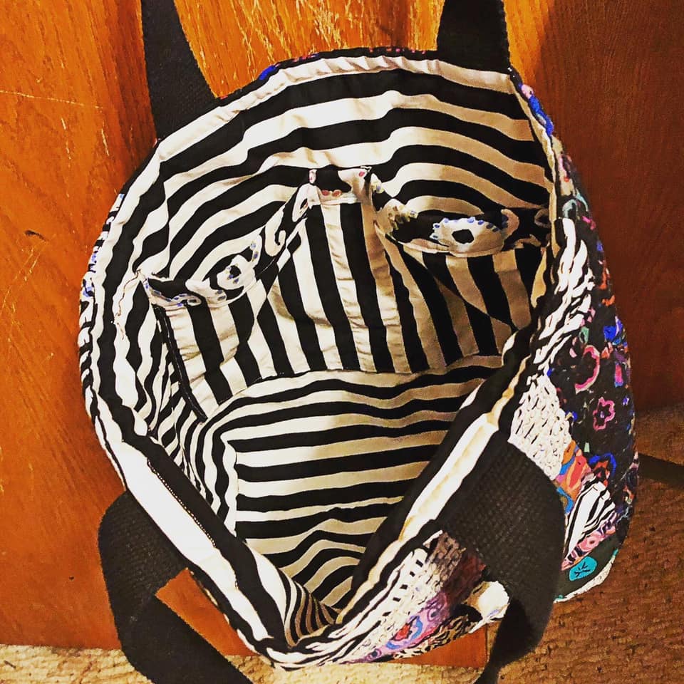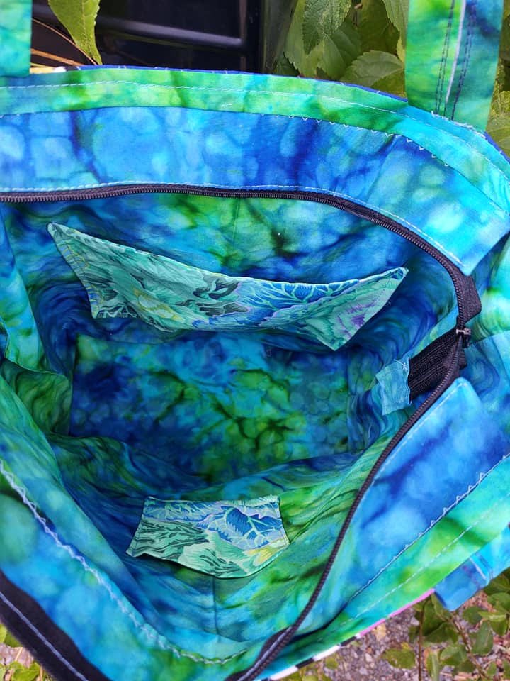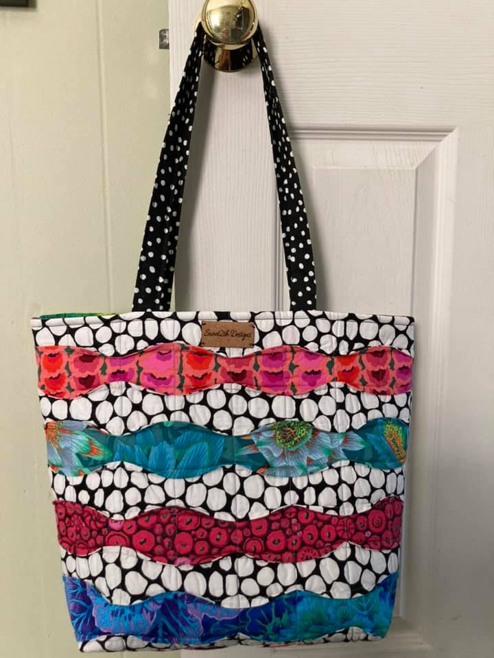 This next bag was made by Mary Beth Henke. I love the limited fabrics she used on the wavy design. And that tag on the lining is just so good! I can’t stop laughing about it! I always say that I weave a little profanity into everything I make!