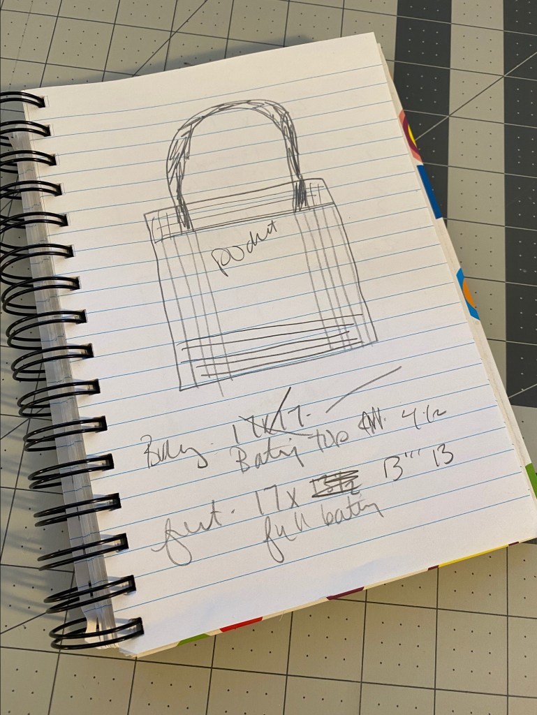 But I’ve also been thinking about a new bag idea. I want to make something that has exterior pockets that are sort of constructed as part of the bag body. I made a few drawings and measurements earlier today. I’m not quite where I need to be to start cutting and sewing.