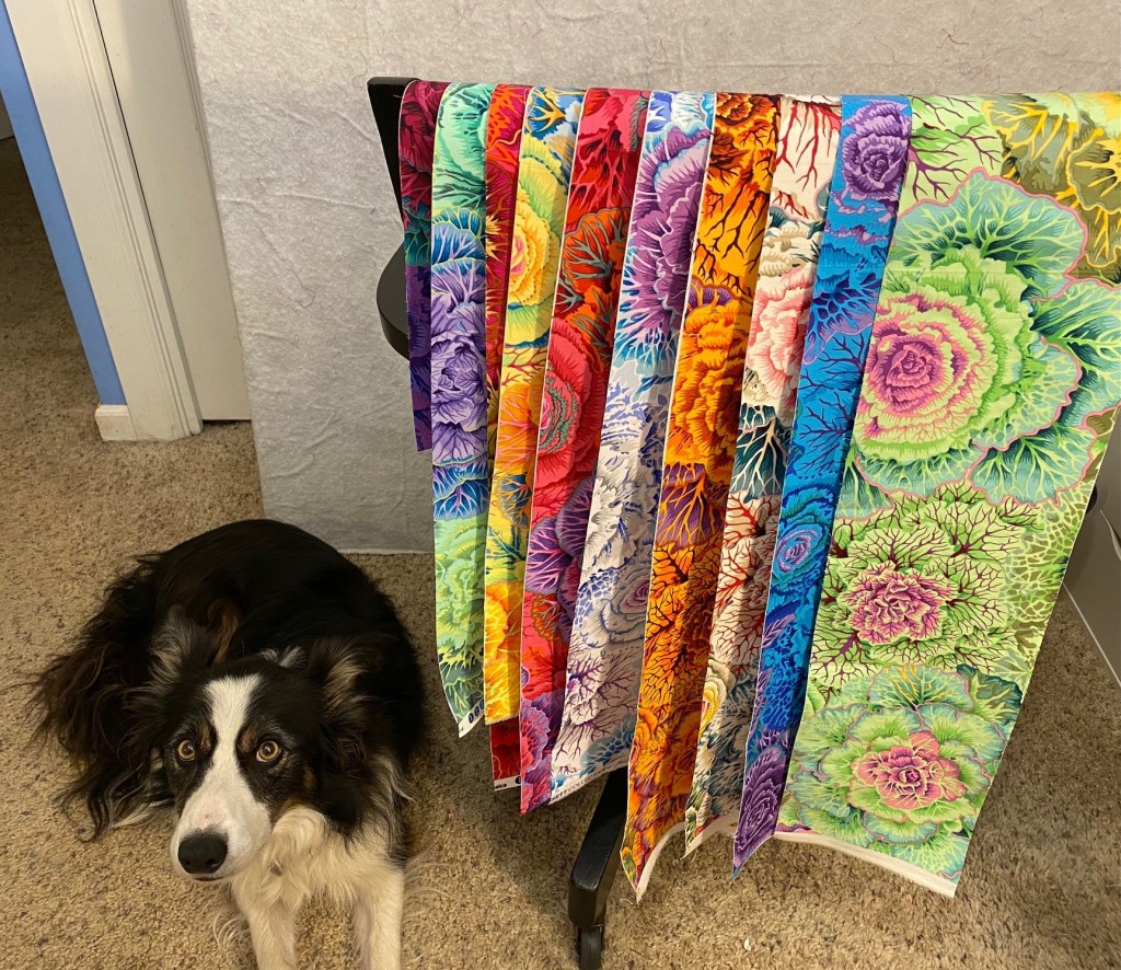 This is the first time I’ve used the Kaffe Fassett Collective wide backings and I couldn’t be happier with it. The colors are so vibrant and the fabric is soft and velvety –the texture is really something. I will definitely use more of these wide backings in the future. It will be fun to see more and more designs appear in the wide back.